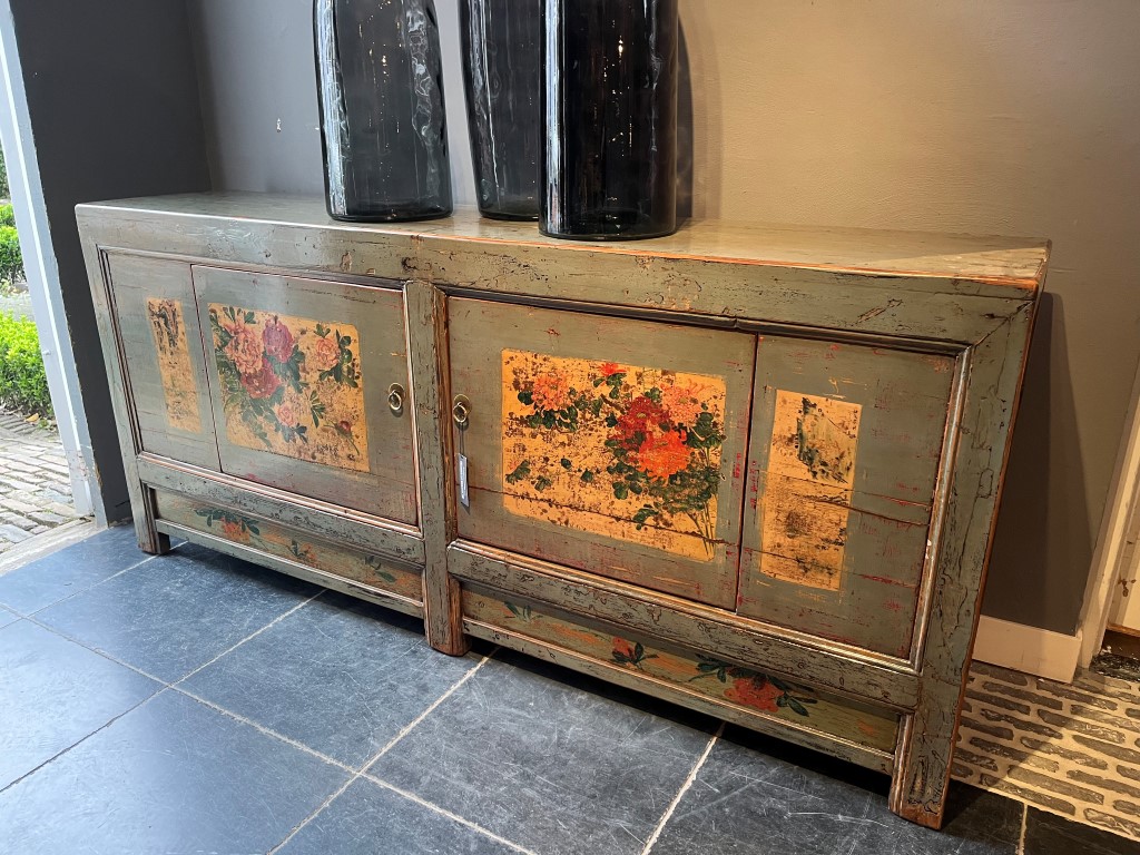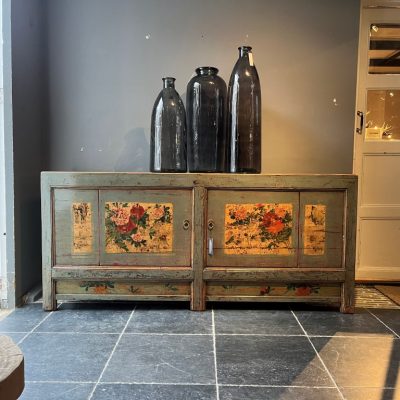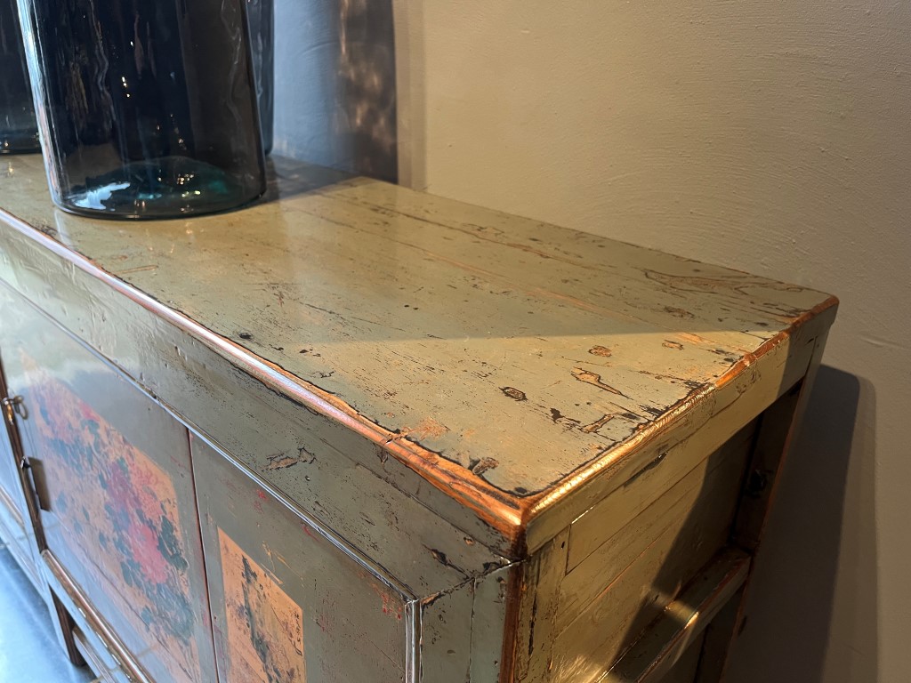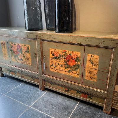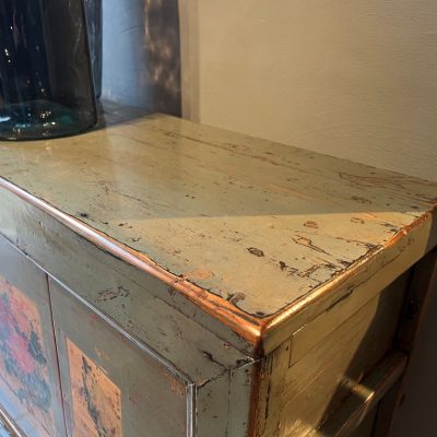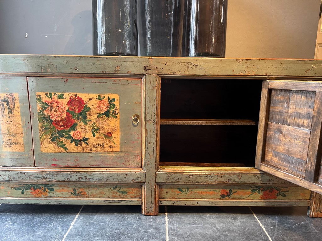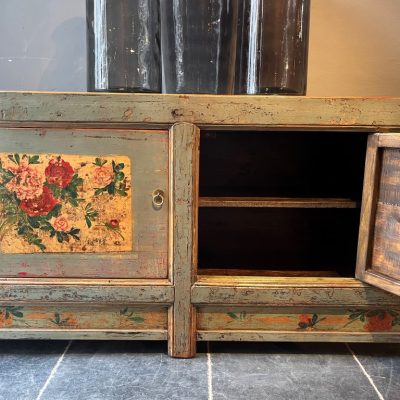 Groen gelakt dressoir met beschildering met 2 deuren. De planken in de kast zijn uitneembaar.