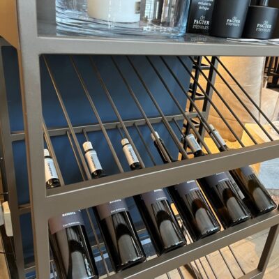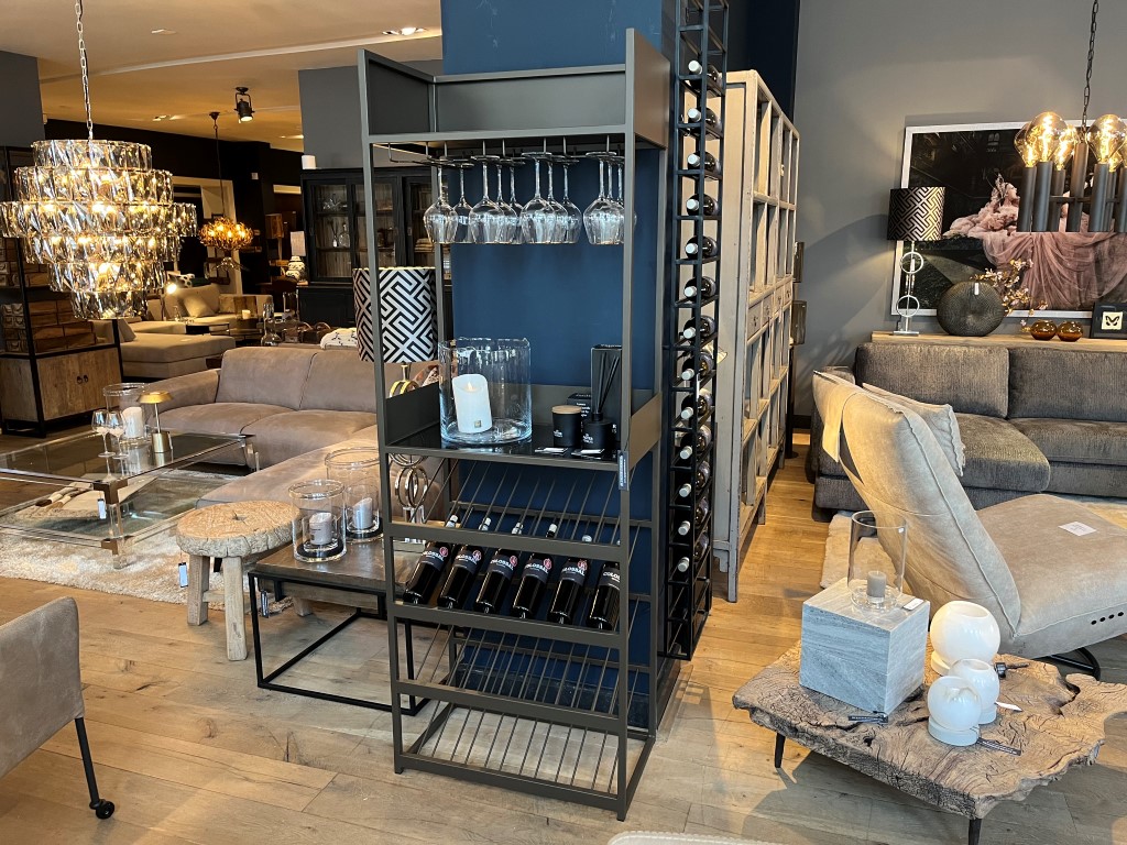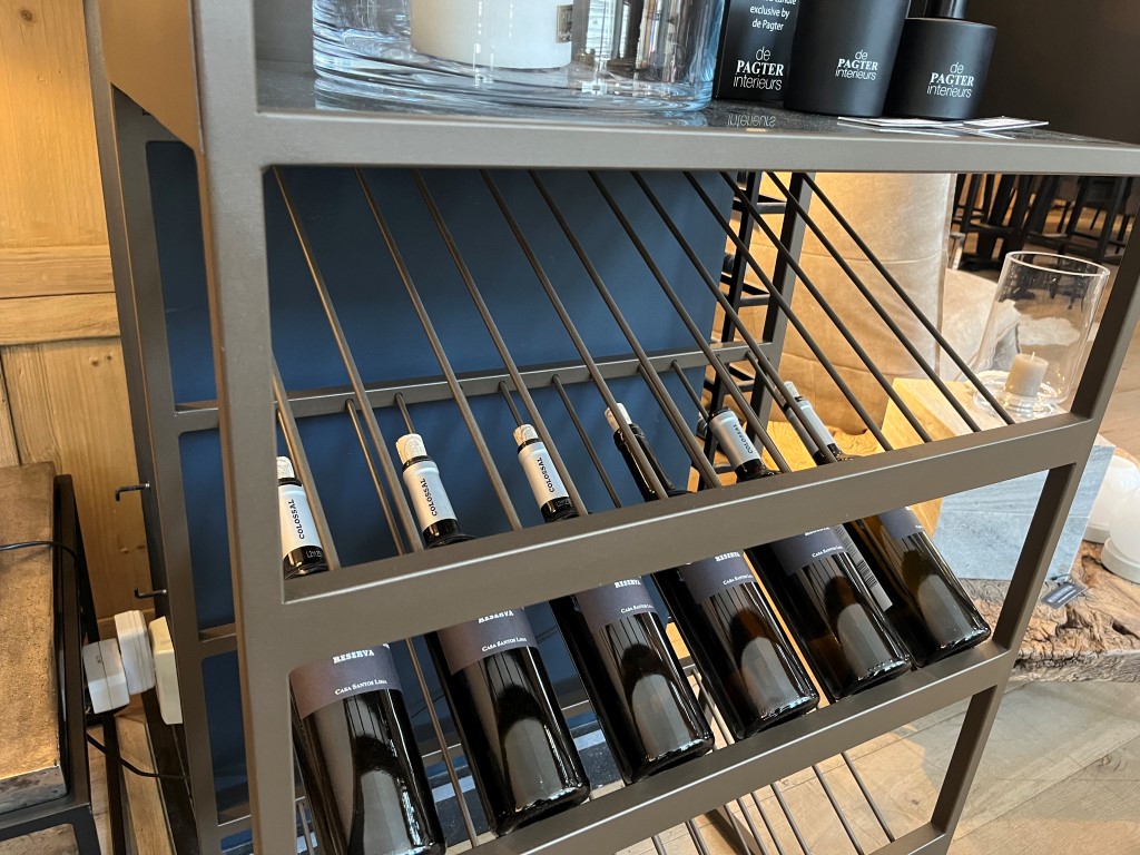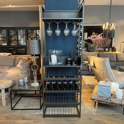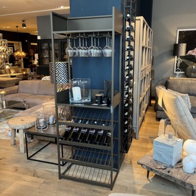 Wijnkast ‘Sky Scraper’, gemaakt van metaal en glas. Ook in het zwart verkrijgbaar.