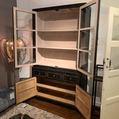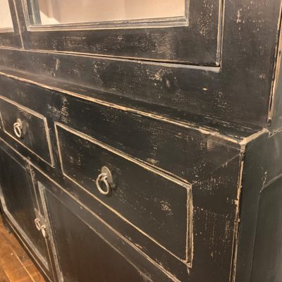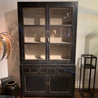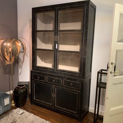 Zwarte vitrinekast ‘Atlanta’ met 4 deuren en 3 lades, gemaakt van old pine hout.
