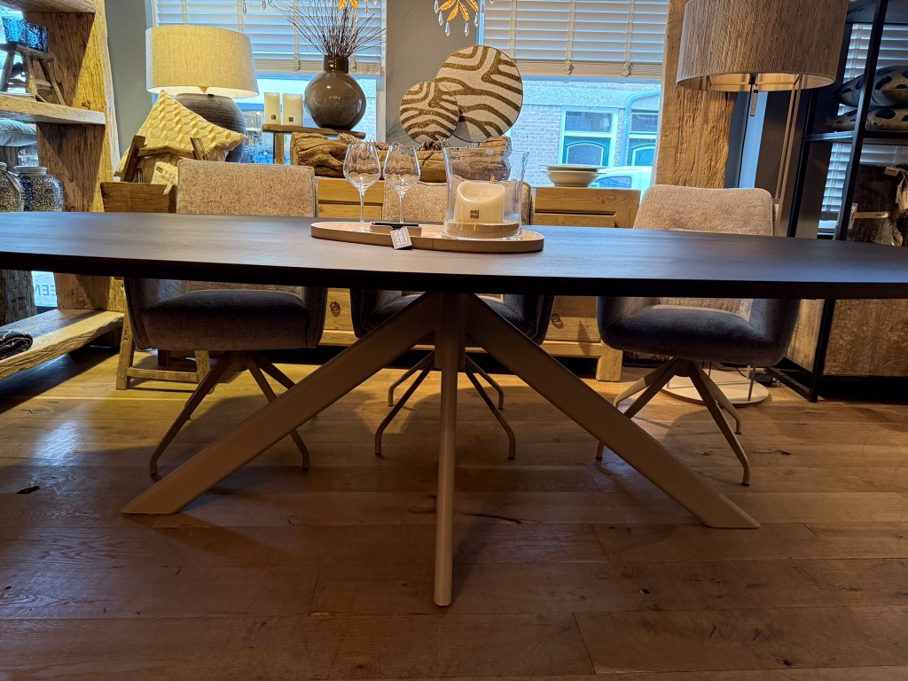 Het tafelblad is verjongd en wordt ondersteunt door een metalen poot ‘Burton 180CM’ in ‘Magnum’-kleur.