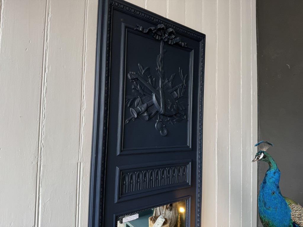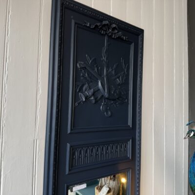 Donkerblauwe, antieke spiegel met houtsnijwerk, gemaakt van hout.