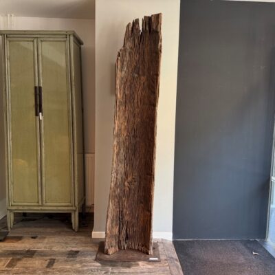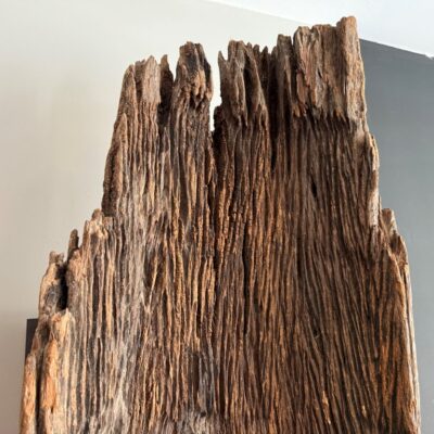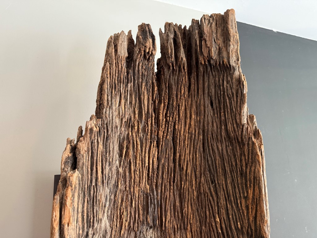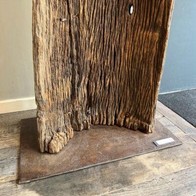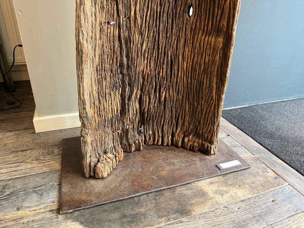 Decoratieve, olmenhouten boomstam op een metalen voetstuk.