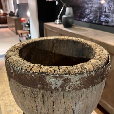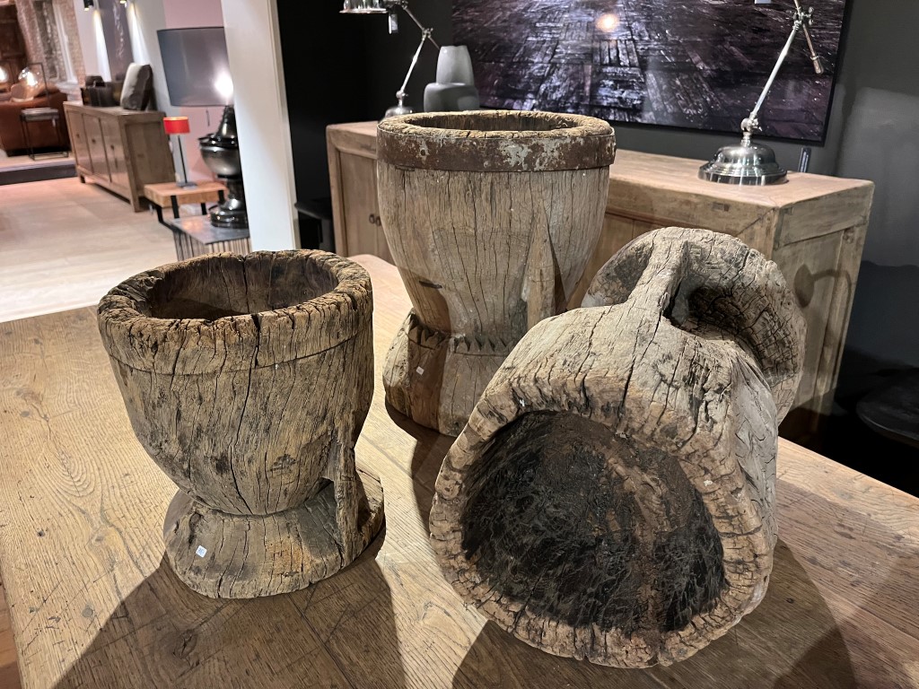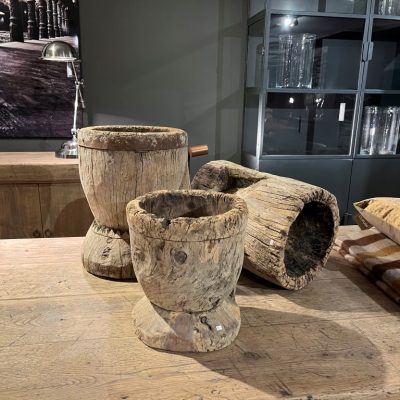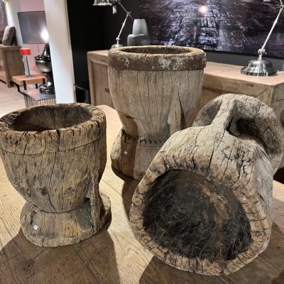 Vazen van grof hardhout. De afmetingen variëren per vaas.
