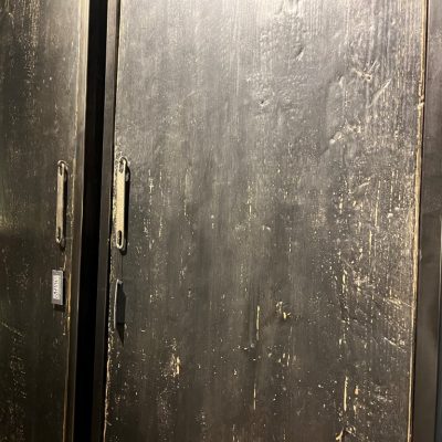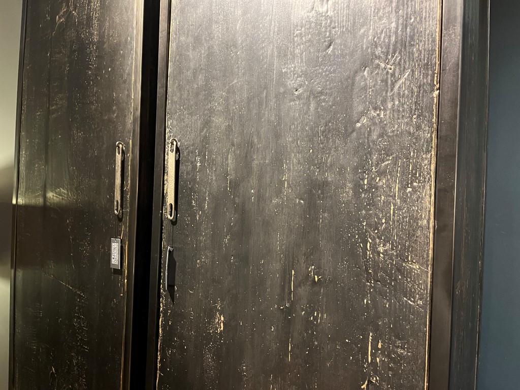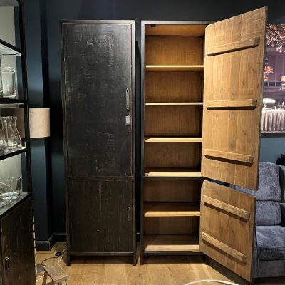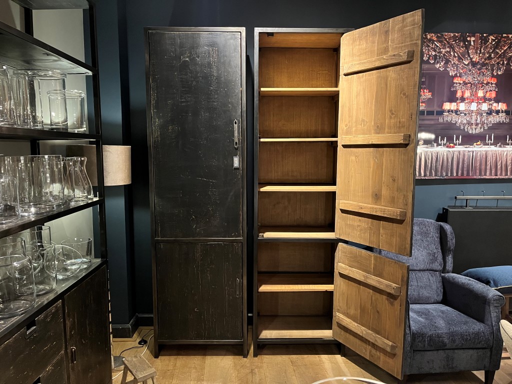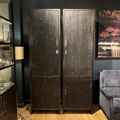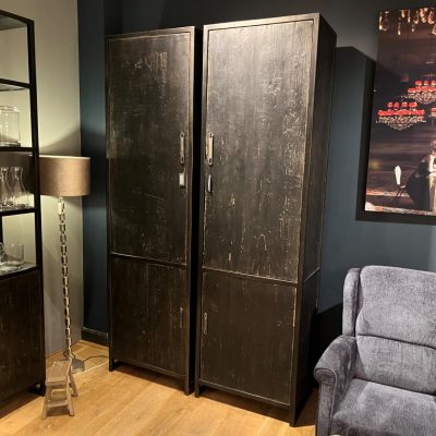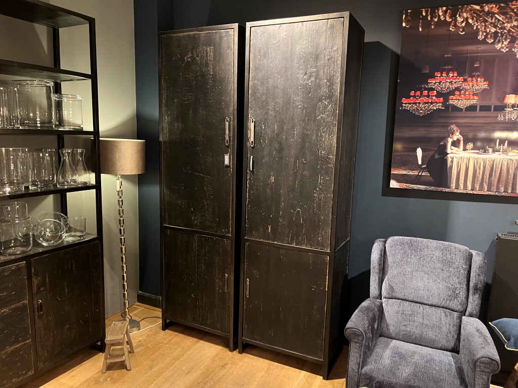 Kast ‘Prato’ met 2 deuren en een metalen frame, uitgevoerd in kleur: ‘vintage black’. De kast van old pine hout is verkrijgbaar met scharnier links of rechts, maar nog leuker als set van 2.