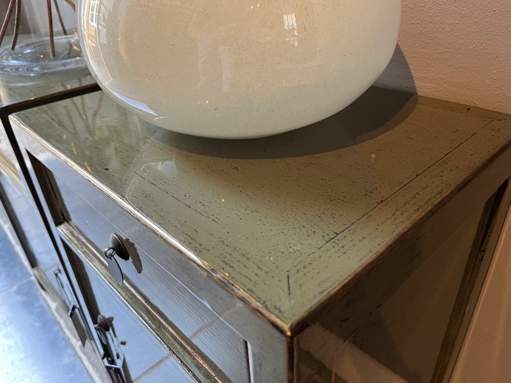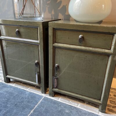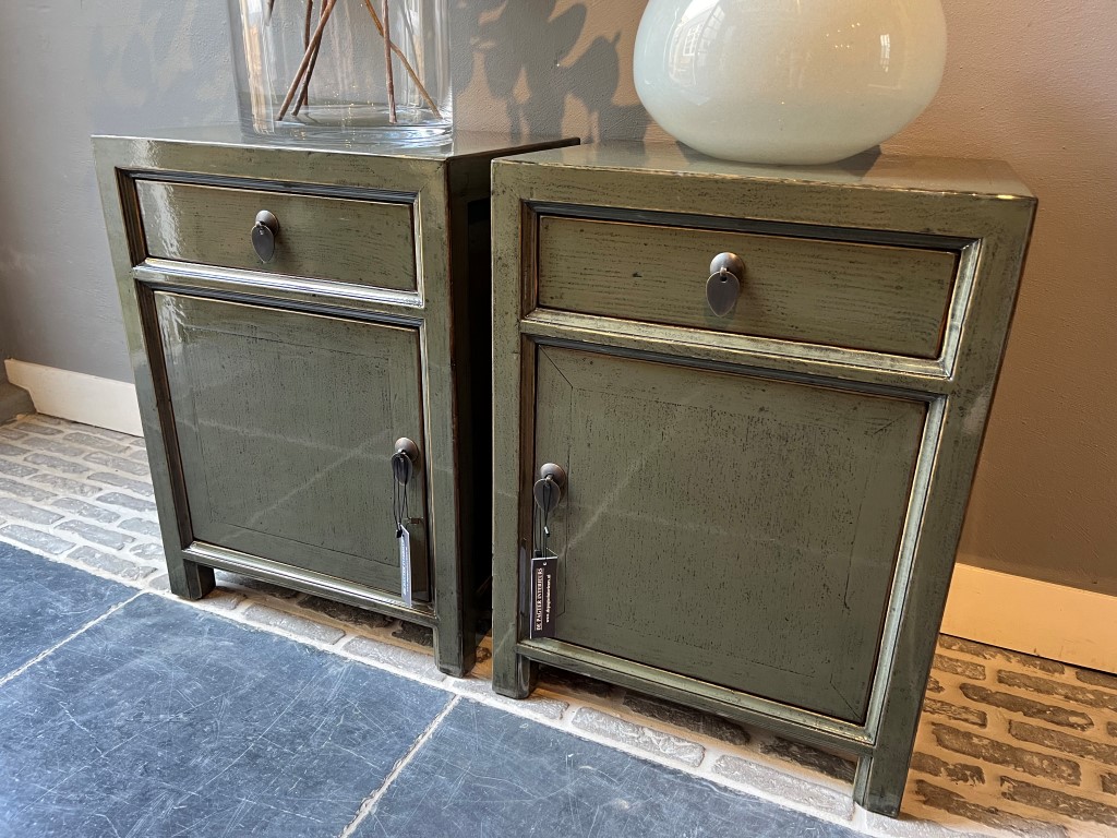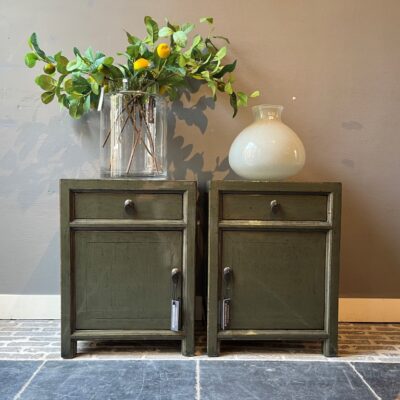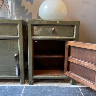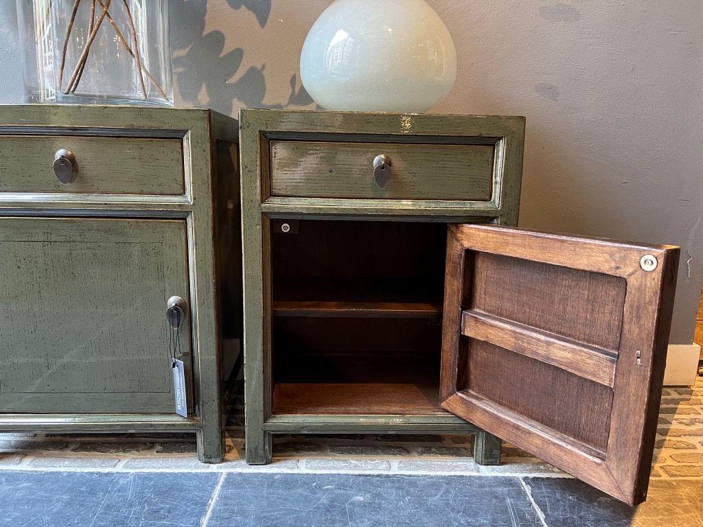 Groen gelakt nachtkastje ‘Mira’ met 1 lade en 1 deurtje, gemaakt van old pine hout. Ook in andere kleuren verkrijgbaar.