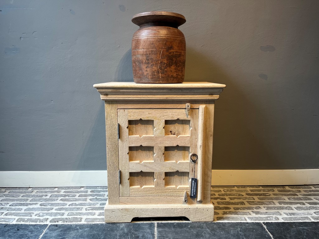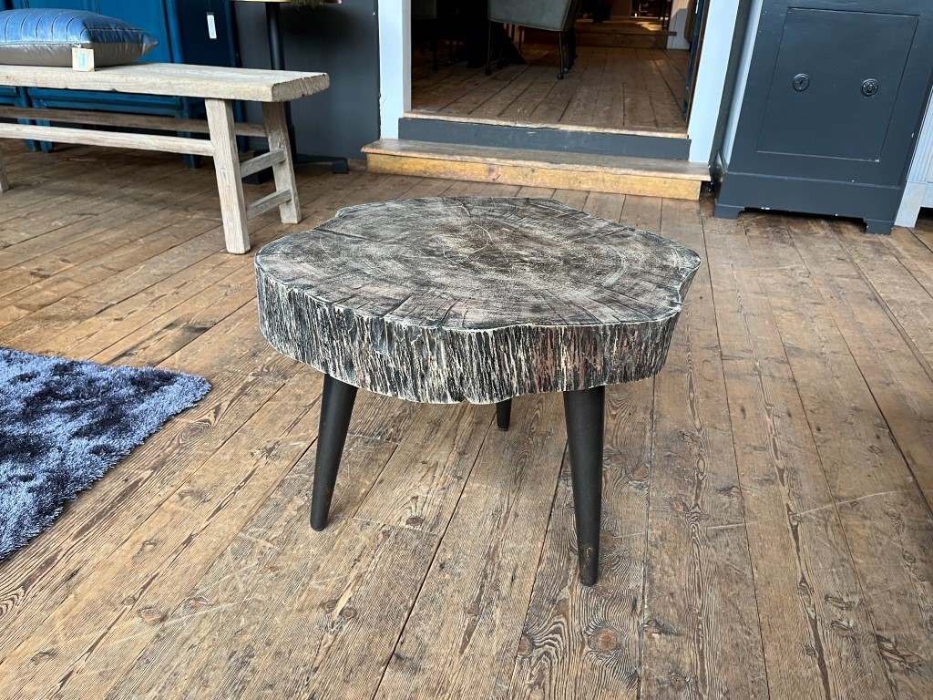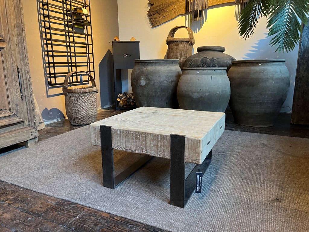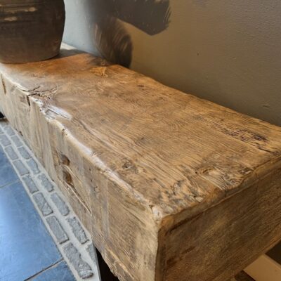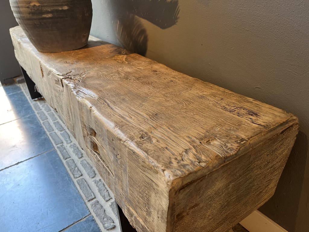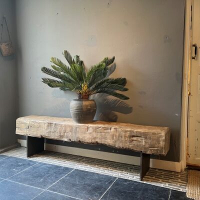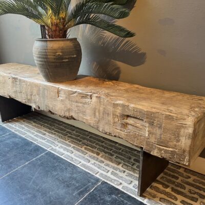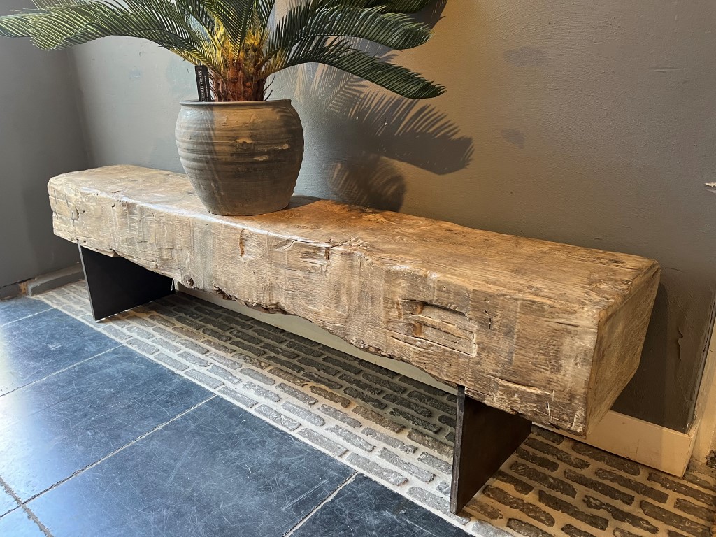Bank, gemaakt van een massief stuk old pine hout en 2 metalen poten.