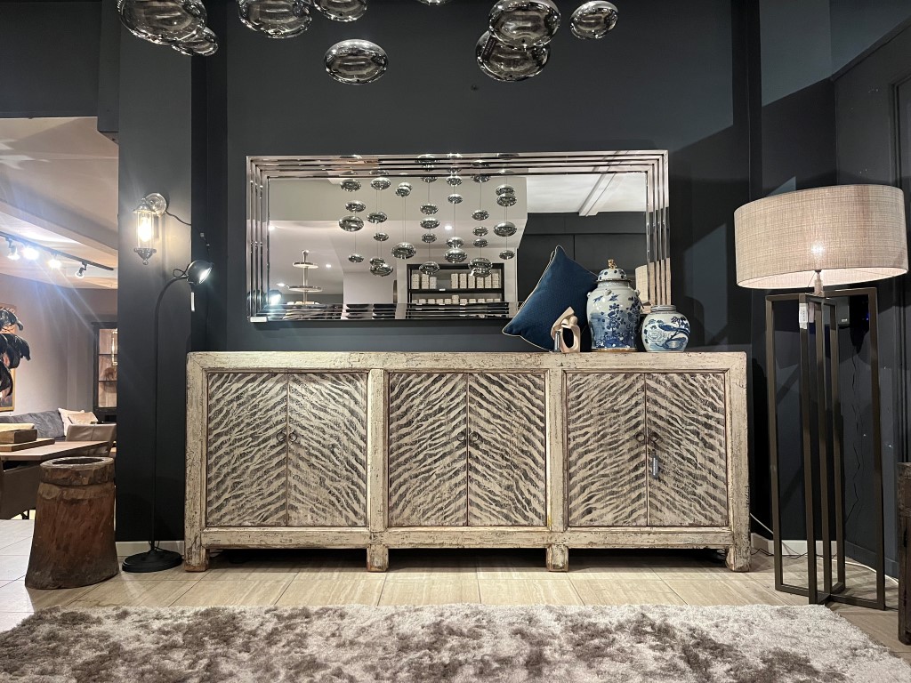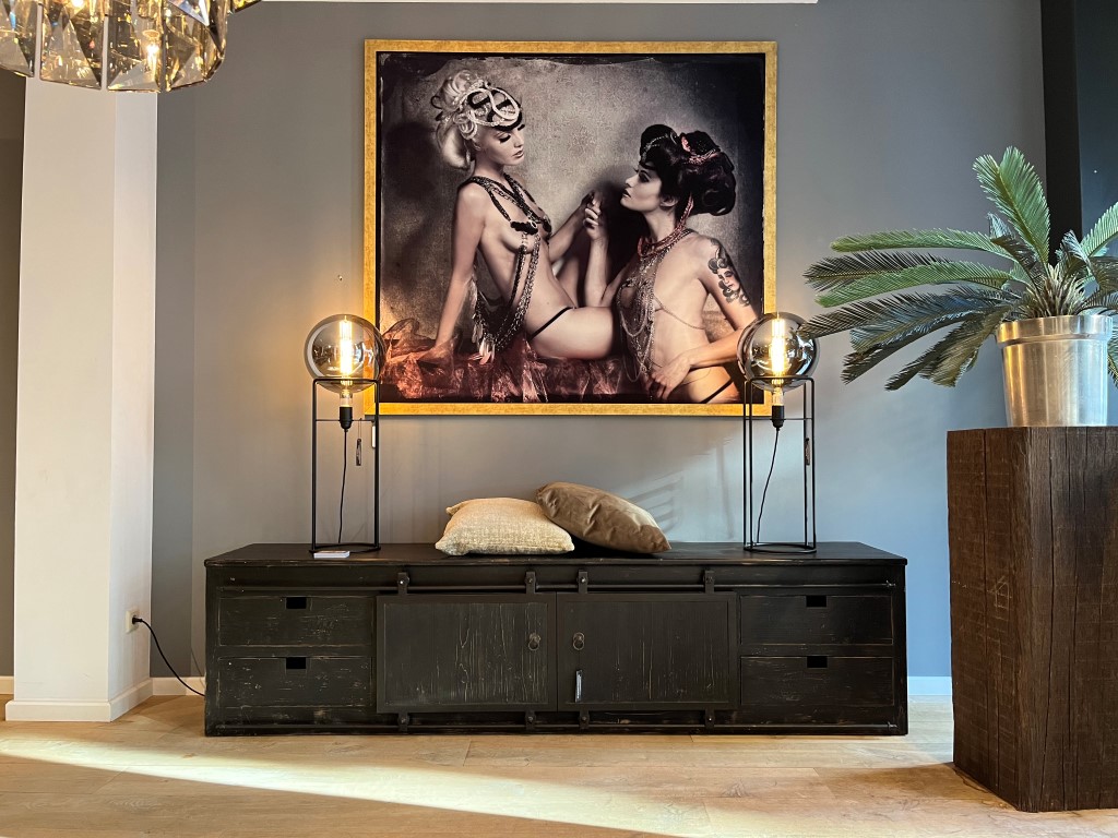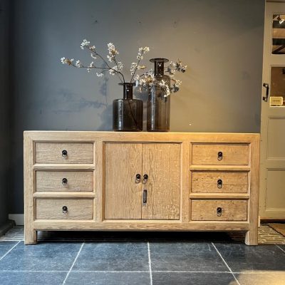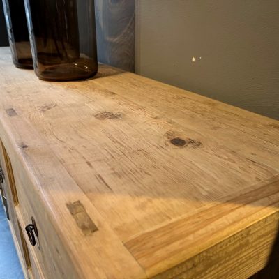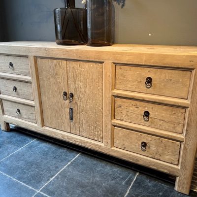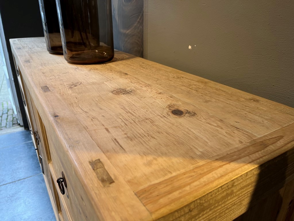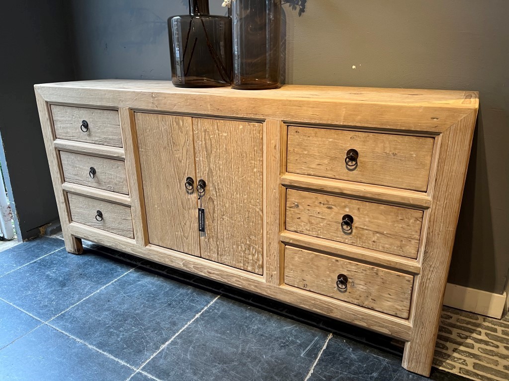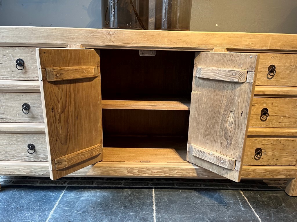 Landelijk dressoir ‘Hana’ met 6 lades en 2 deurtjes, gemaakt van old pine hout. Ook in zwart verkrijgbaar.
