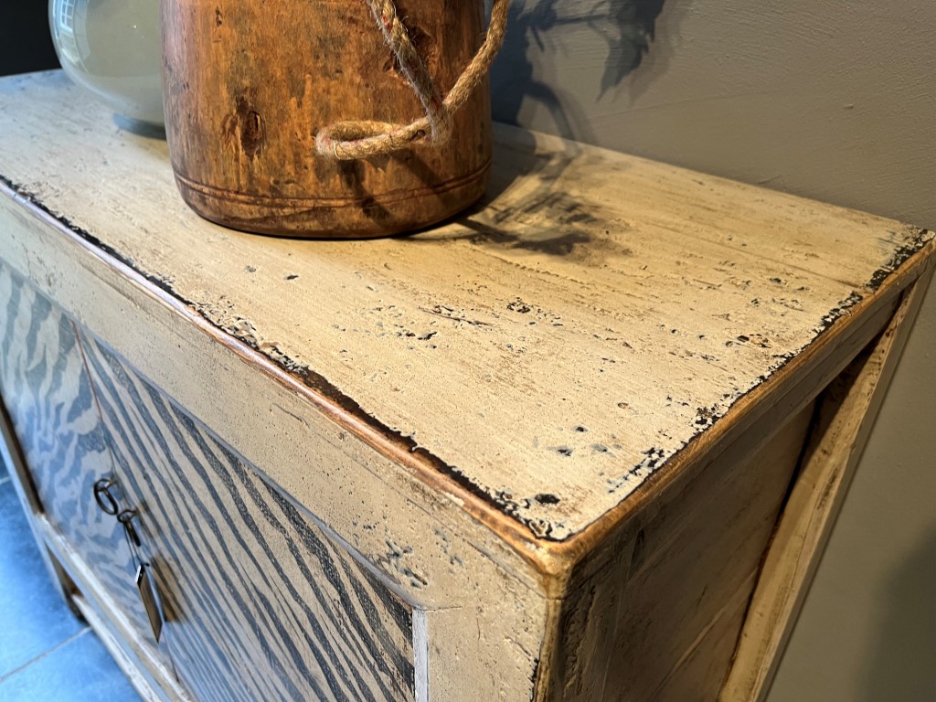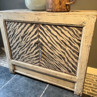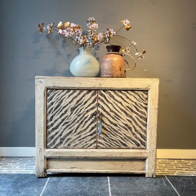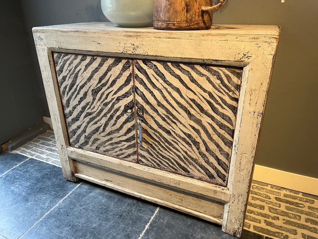 Old pine kastje met 2 beschilderde deuren in zebraprint. Ook in andere afmetingen verkrijgbaar.