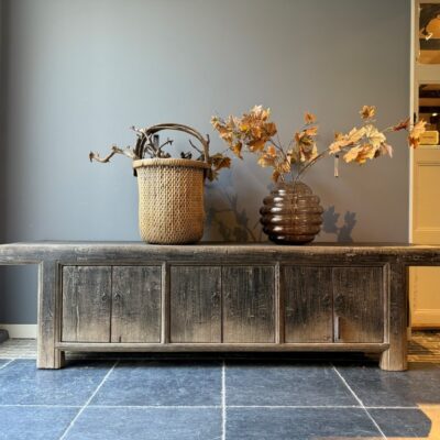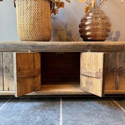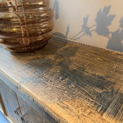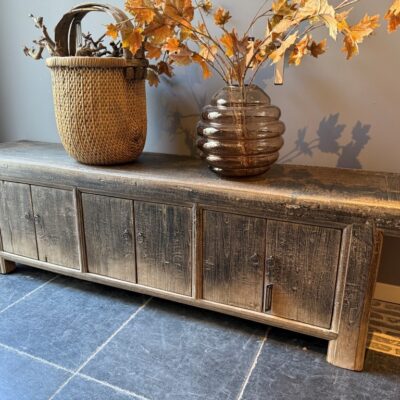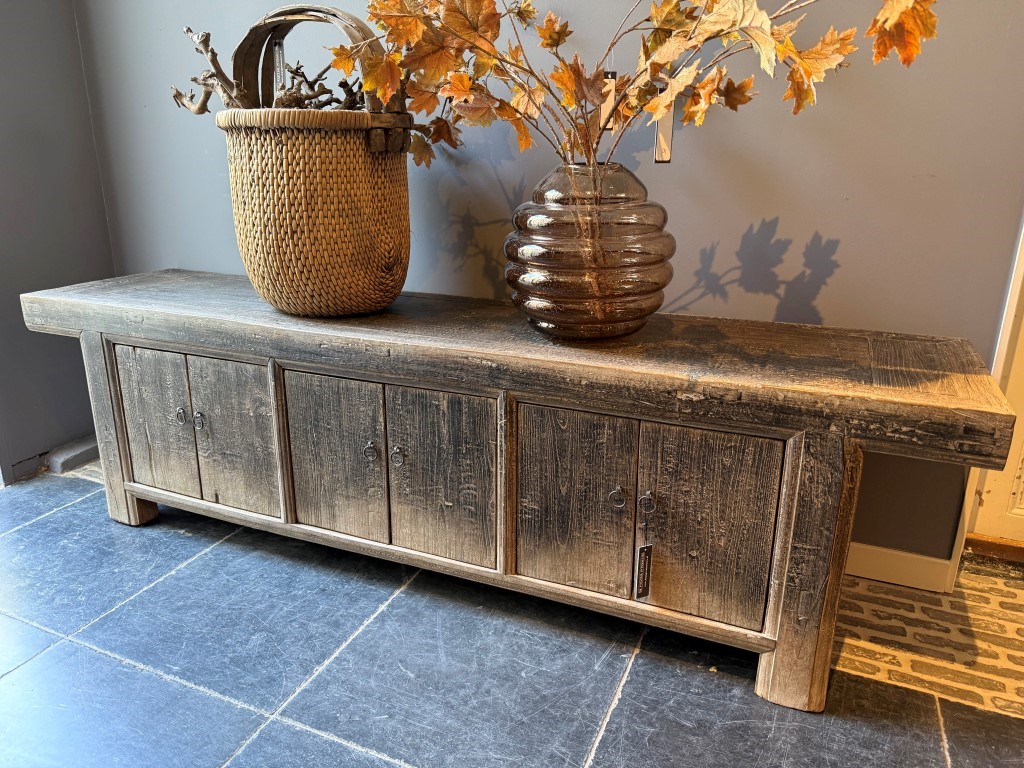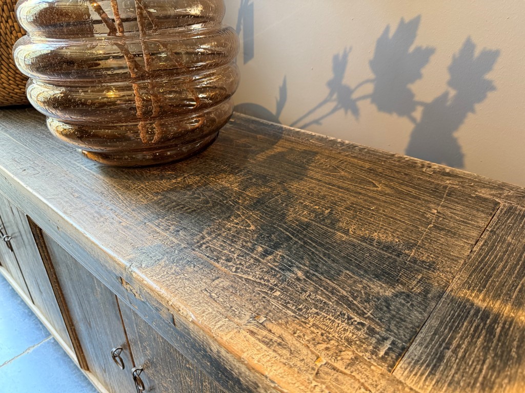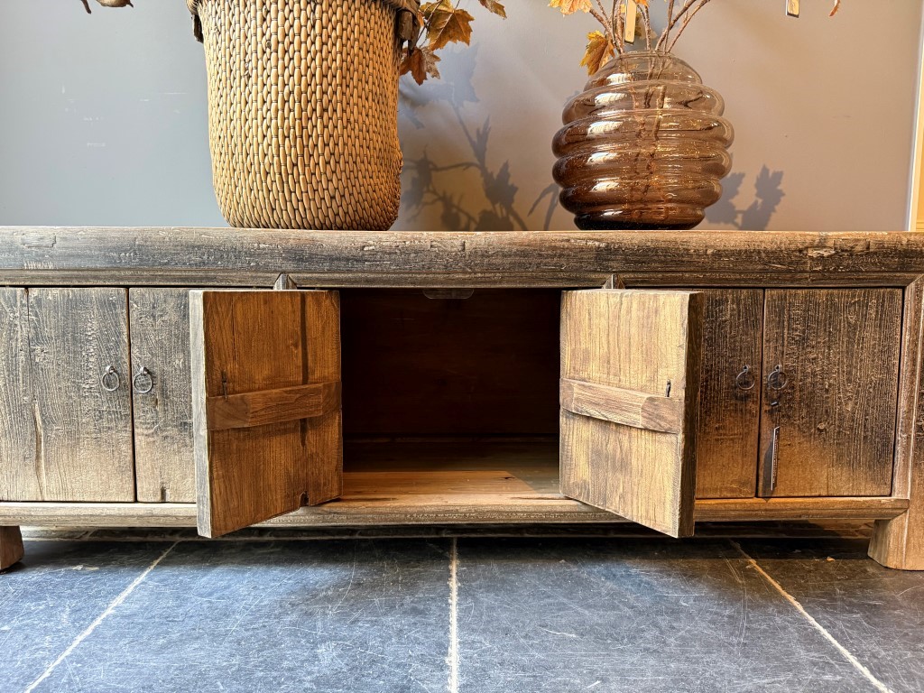 Zwart doorgeschuurd TV-dressoir met 6 deurtjes, gemaakt van old pine hout.