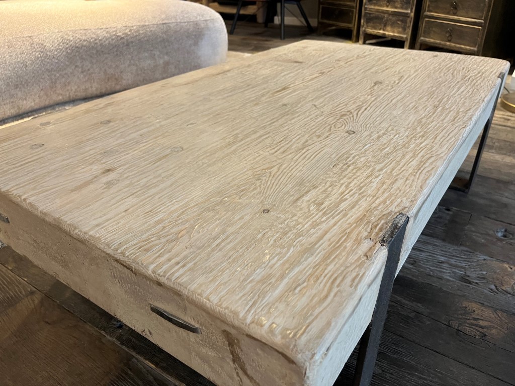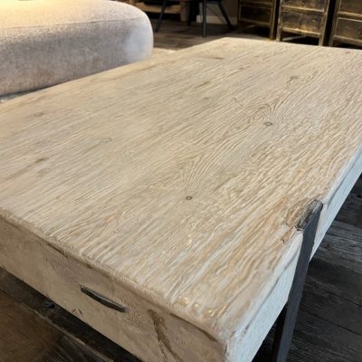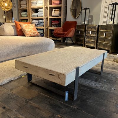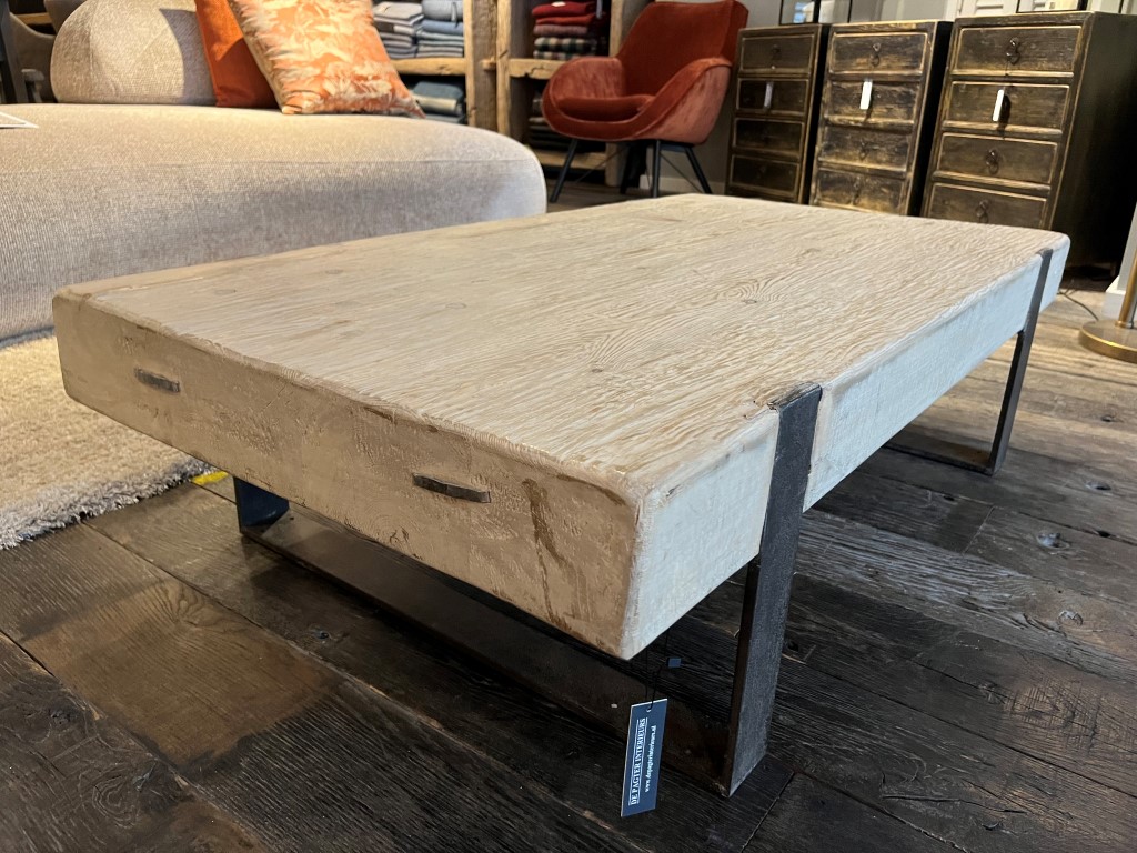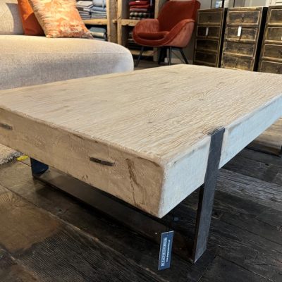 Salontafel ‘Block’ met een 10 centimeter dik blad van old pine hout. Het metalen frame zit ingefreesd in het hout.