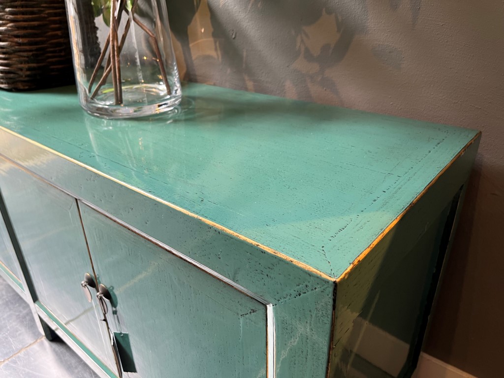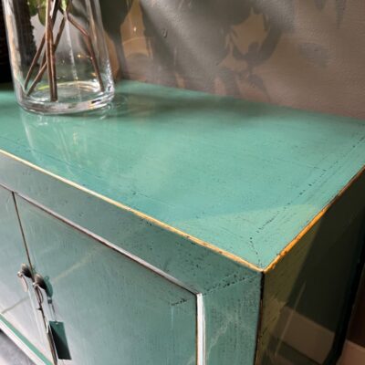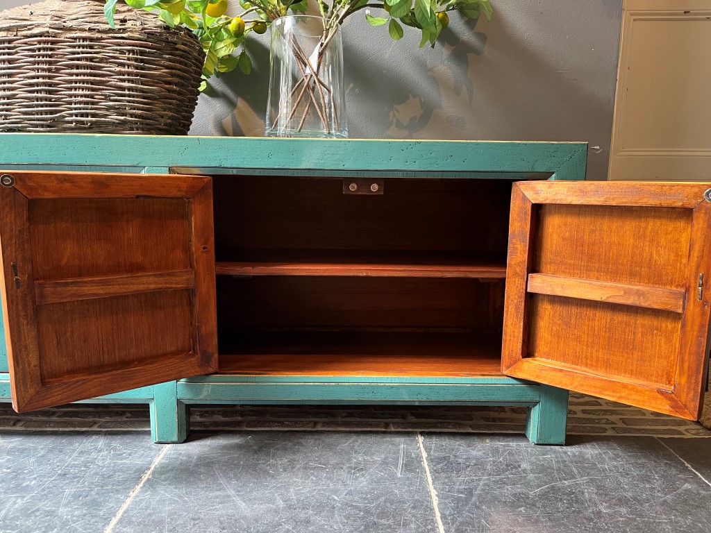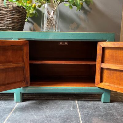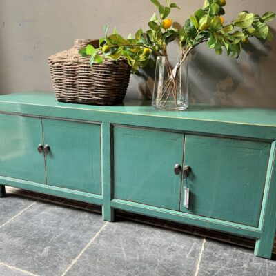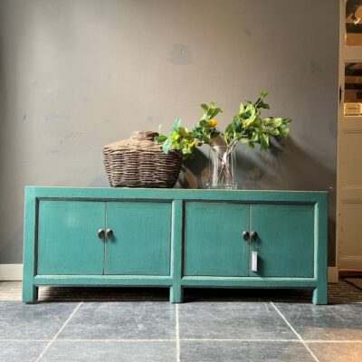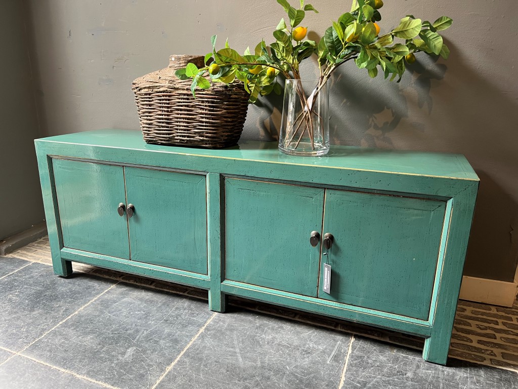 Turquoise gelakt TV-dressoir ‘Ancona’ met 4 deurtjes, gemaakt van old pine hout.