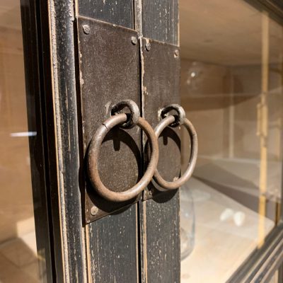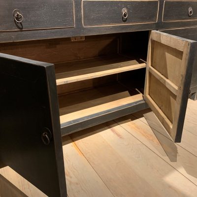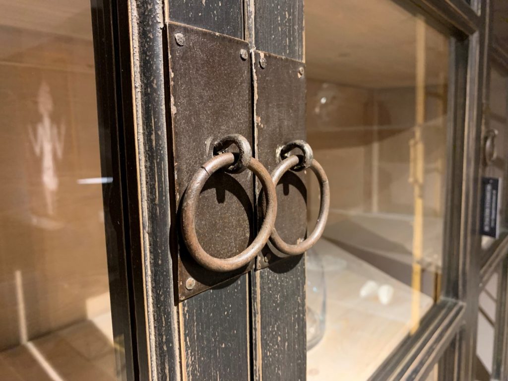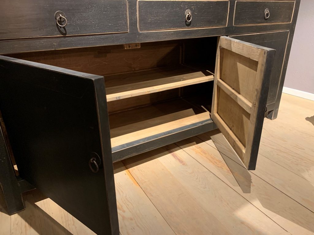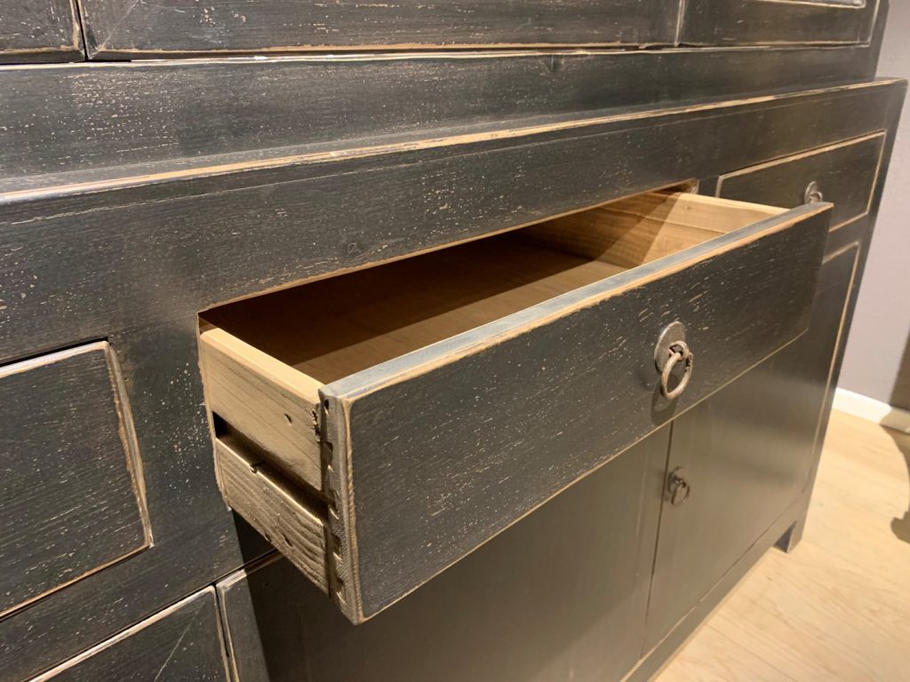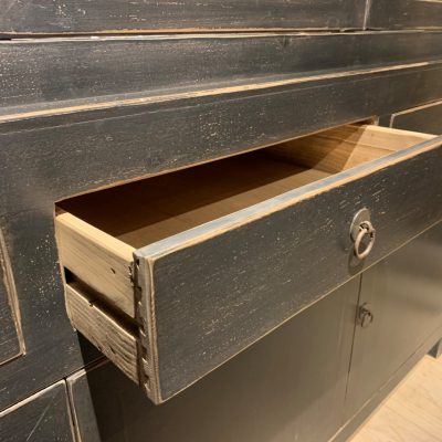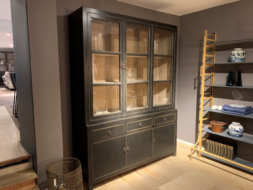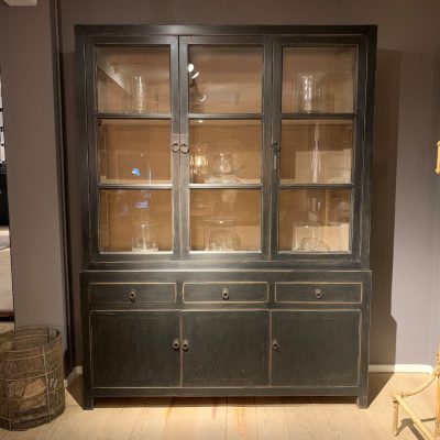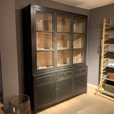 Zwarte vitrinekast ‘Marina XL’, gemaakt van old pine hout. Ook verkrijgbaar in een kleinere maat en in blank old pine hout.