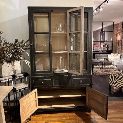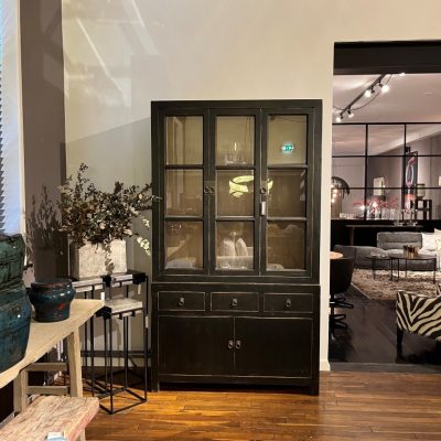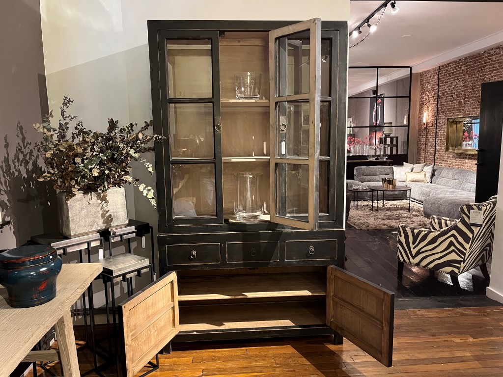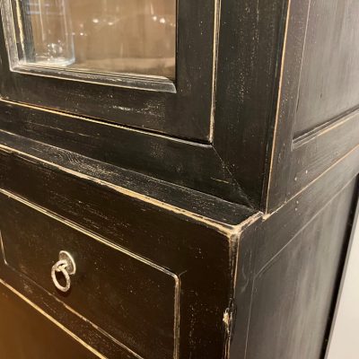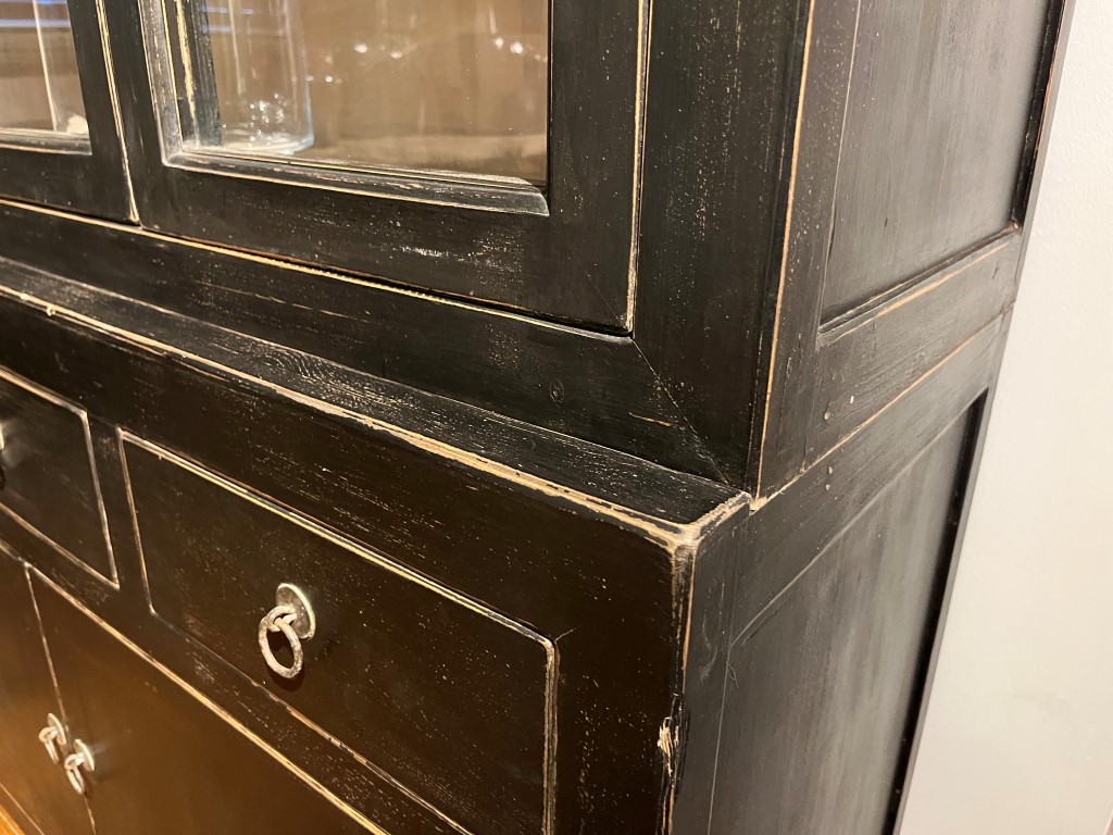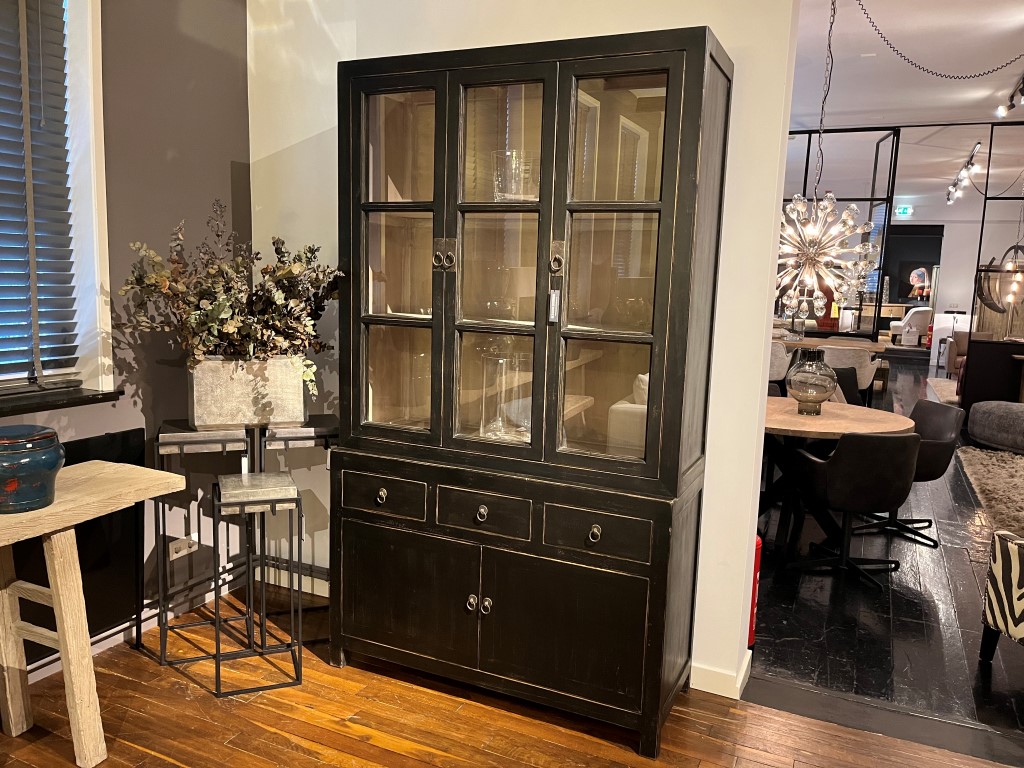 Zwarte vitrinekast ‘Marina’ met 5 deuren en 3 lades, gemaakt van old pine hout. Ook in blank old pine hout verkrijgbaar.