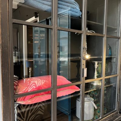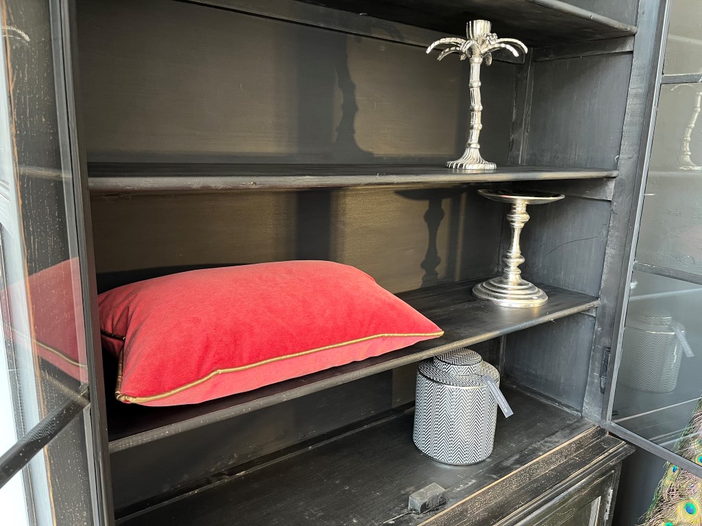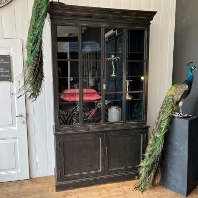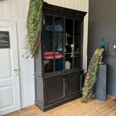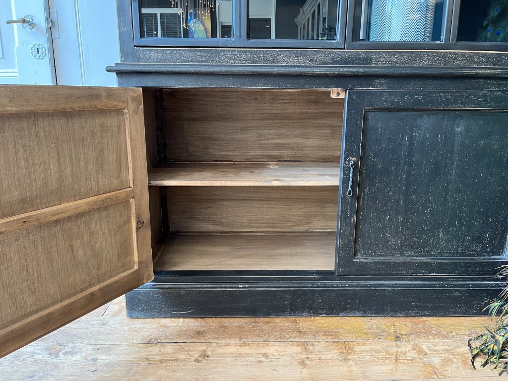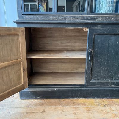 Zwarte vitrinekast ‘Valencia’ met 4 deuren, gemaakt van old pine hout.