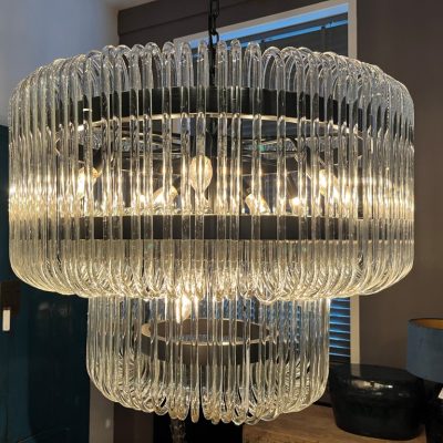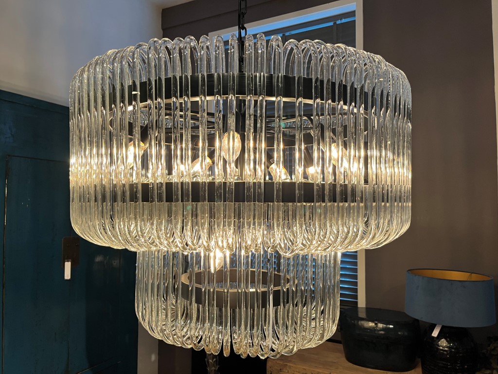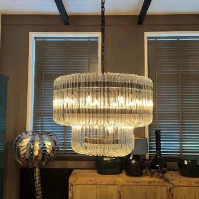 Chandelier ‘Sutton House’ van het merk Eichholtz. De lamp is gemaakt van glas.