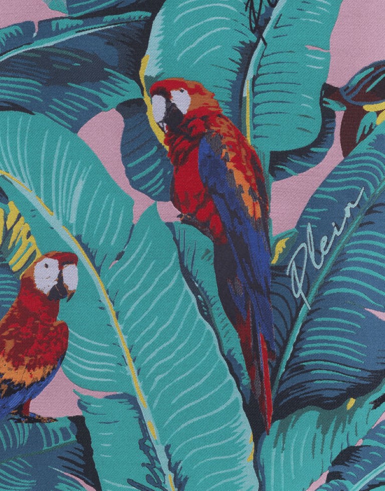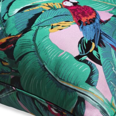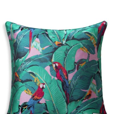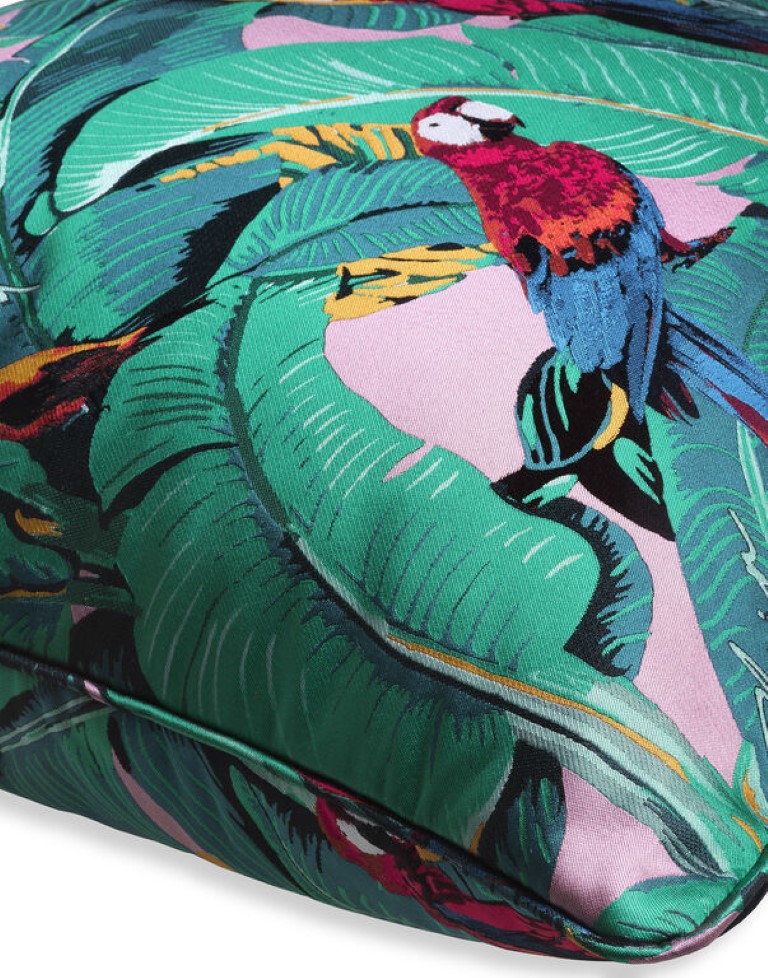 De coole jaren 70-sfeer van het Parrot-kussen in zijdemix en gemaakt in Italië, met zijn verzadigde juweeltinten en handgeschreven handtekening voelt als een uitnodiging om het exotische buitenleven naar binnen te halen.