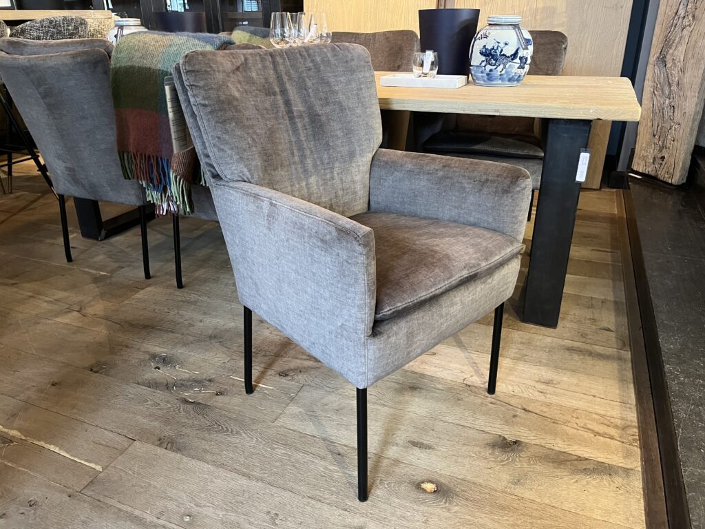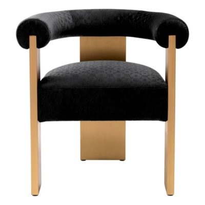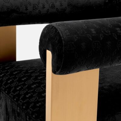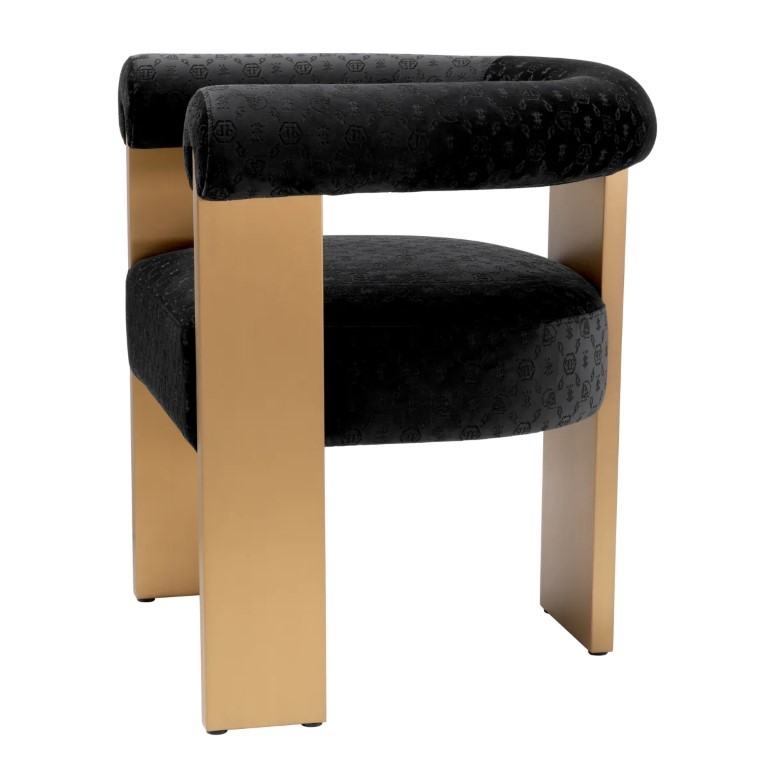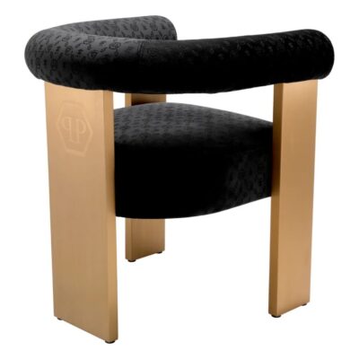 De Icon eetkamerstoel is bekleed met een rijk zwart fluweel met het op maat gemaakte Philipp Plein lasergesneden logo en afgewerkt met antiek geborsteld messing. De stoel straalt eigentijdse elegantie en luxe uit.