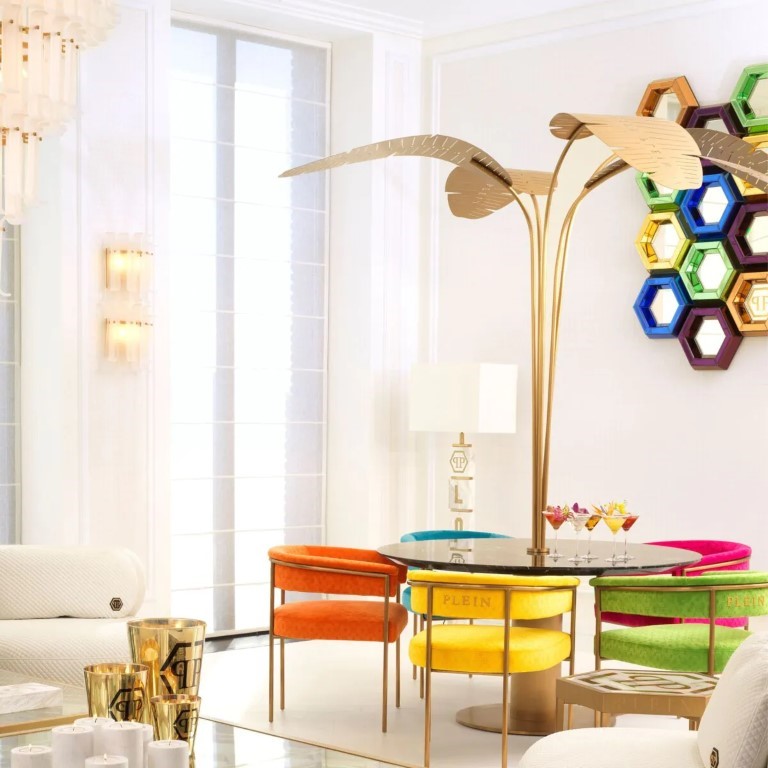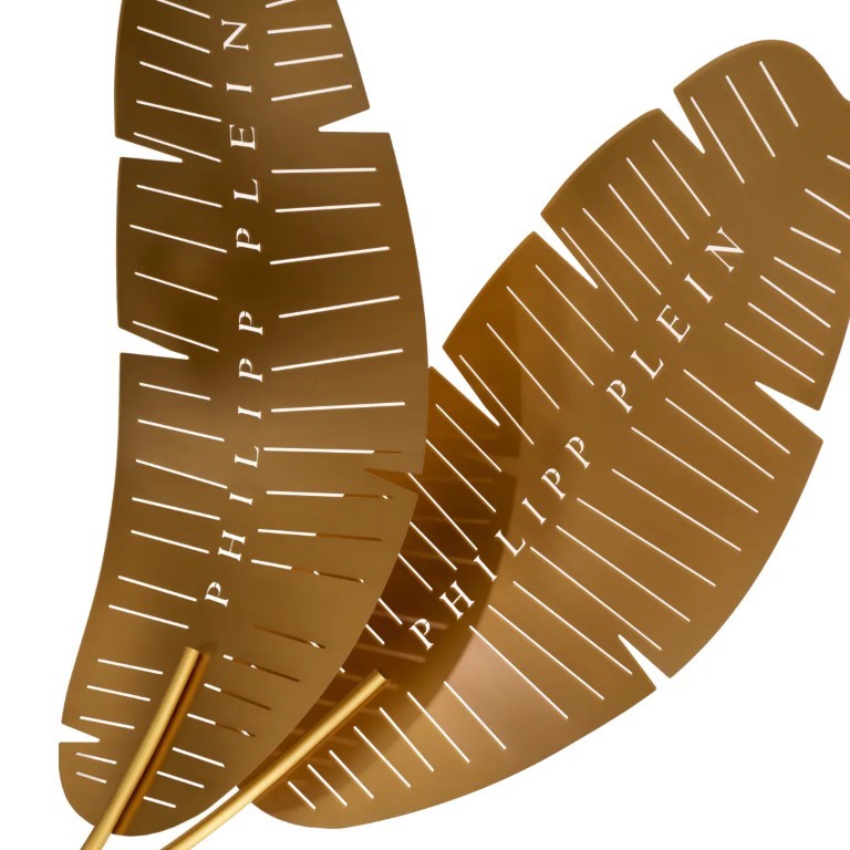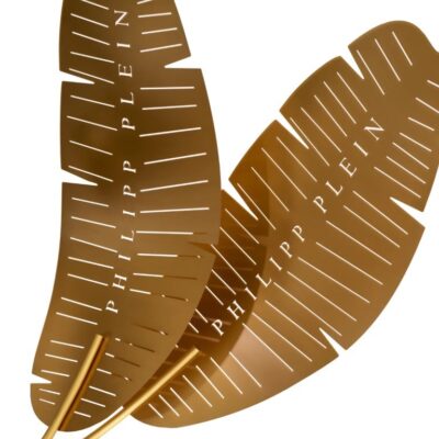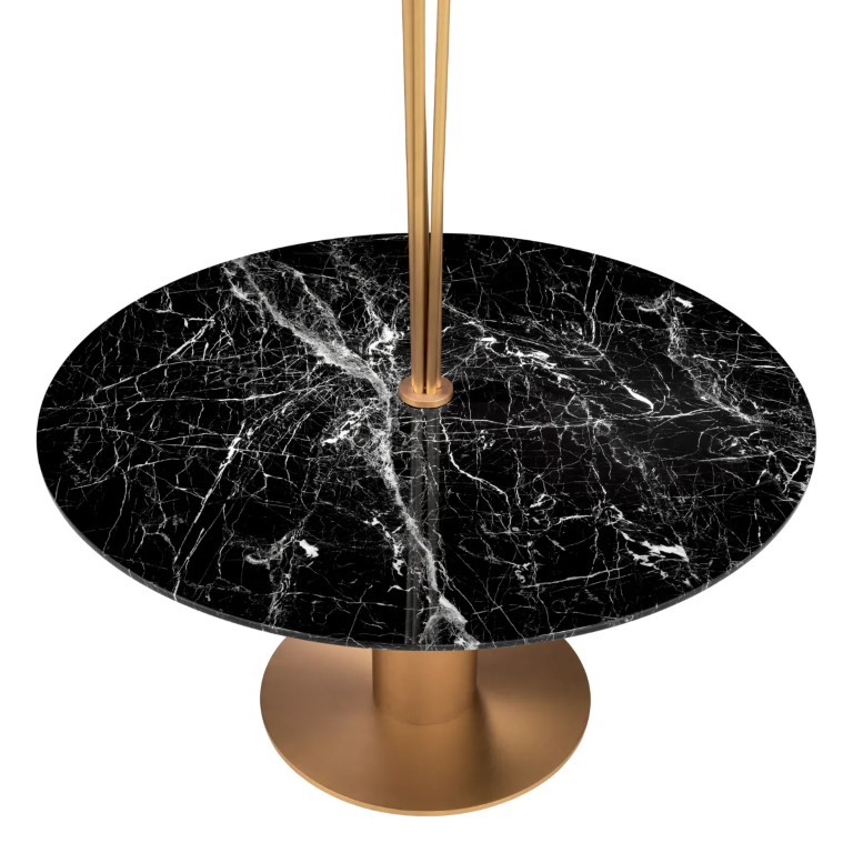 Deze decoratieve eettafel in zwart imitatiemarmer combineert speelsheid en weelde en is geïnspireerd op Philipp Pleins liefde voor The Beverly Hills Hotel. De tafel heeft een gelaagde, antieke, gouden palmboom en een voetstuk.