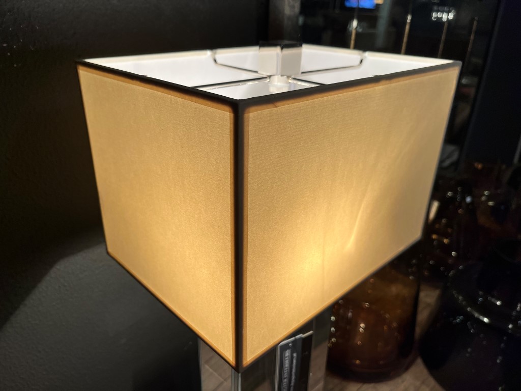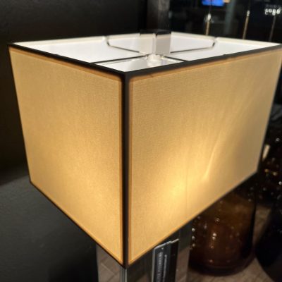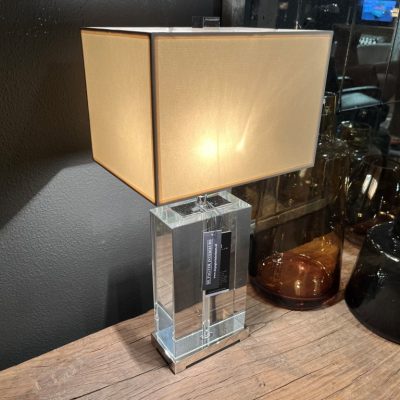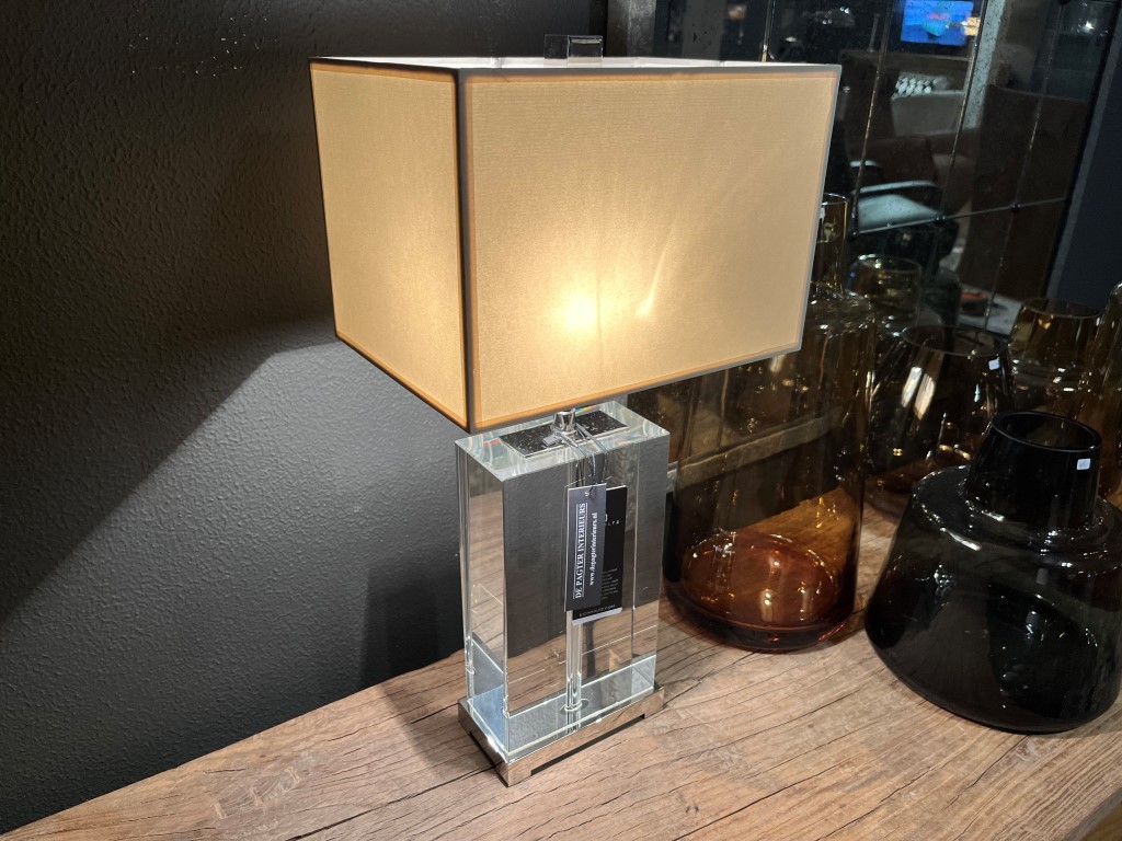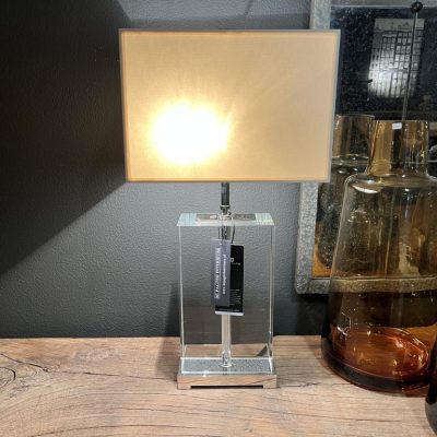 Lamp ‘Bridgefield’ van het merk Eichholtz. De lamp heeft een glazen voet en een stoffen kap.