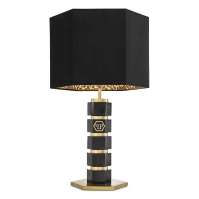 Deze zeshoekige tafellamp is met zijn gefacetteerde zwarte marmeren elementen en antieke koperen steel typisch Philipp Plein. De ‘Hexagon’ tafellamp vormt een perfecte aanvulling voor de woonkamer met zijn contrasterende zeshoekige kap met luipaardprint.