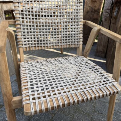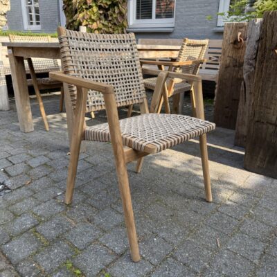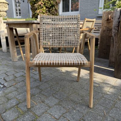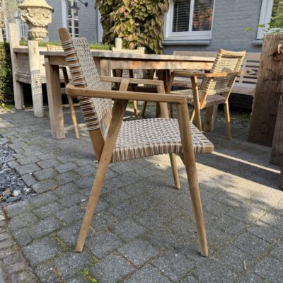 Teakhouten tuinstoel ‘Gina’. De stoelen zijn opstapelbaar en dus gemakkelijk op te slaan.