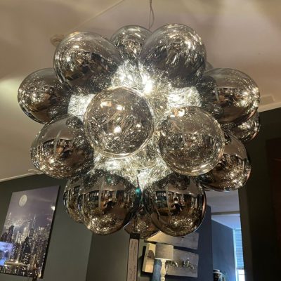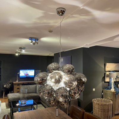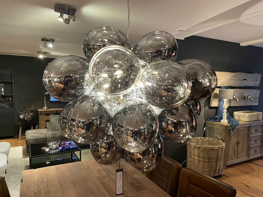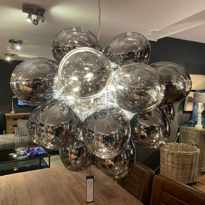Hanglamp, gemaakt van meerdere bollen van ‘smoke’ glas.