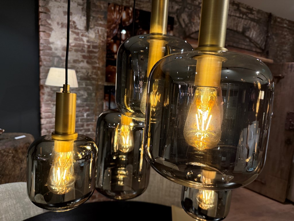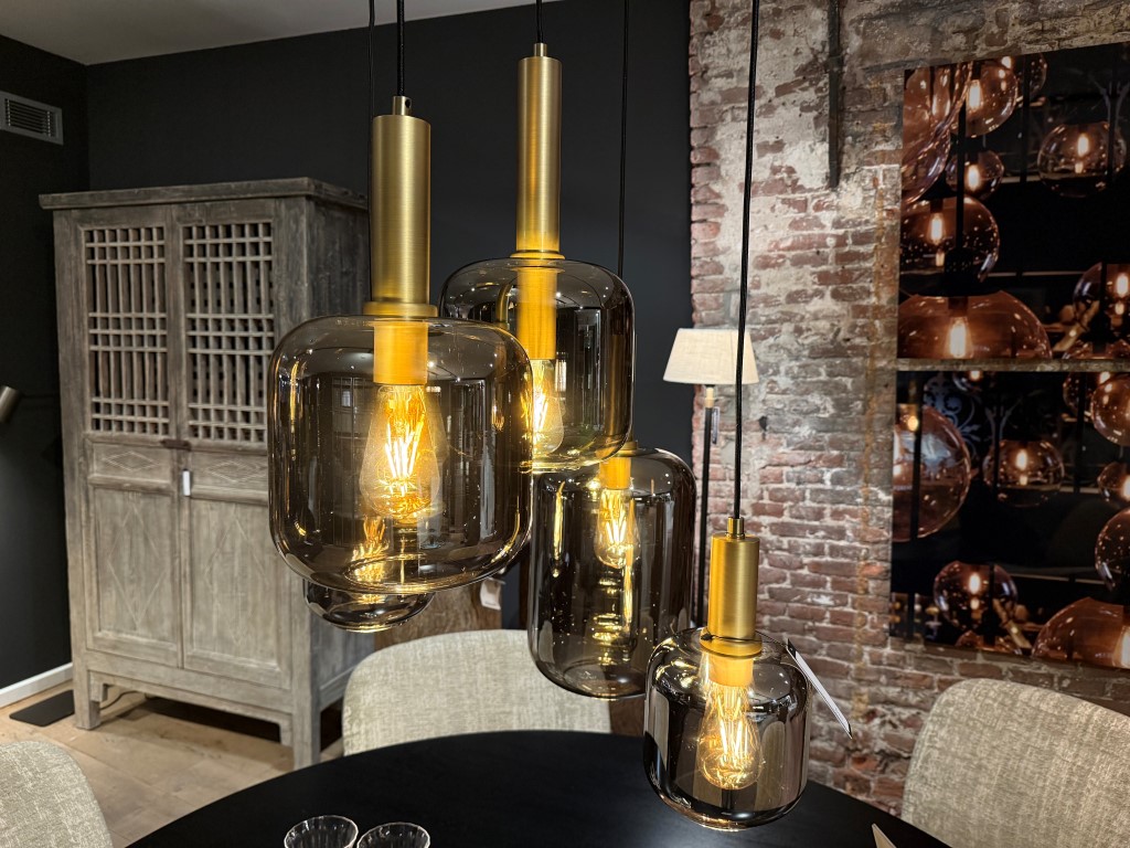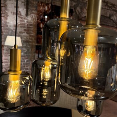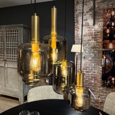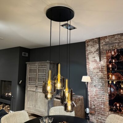 Hanglamp ‘Matera’ met 5 lichtbronnen en een stalen plafondplaat. De lengte van de snoeren is verstelbaar.