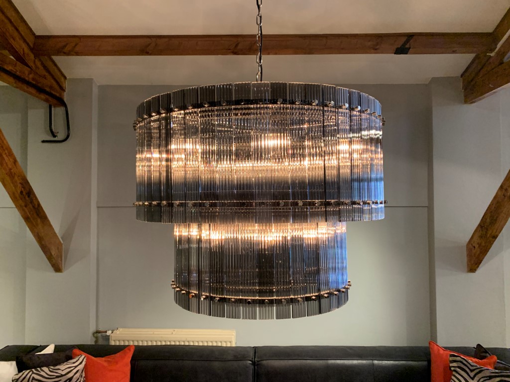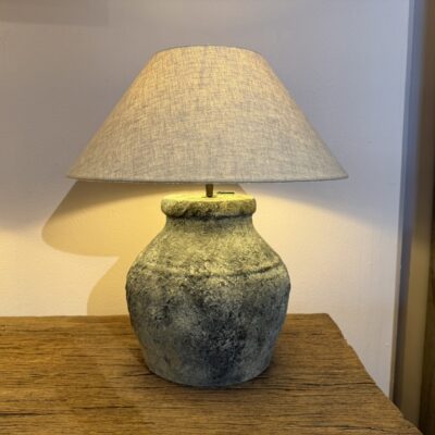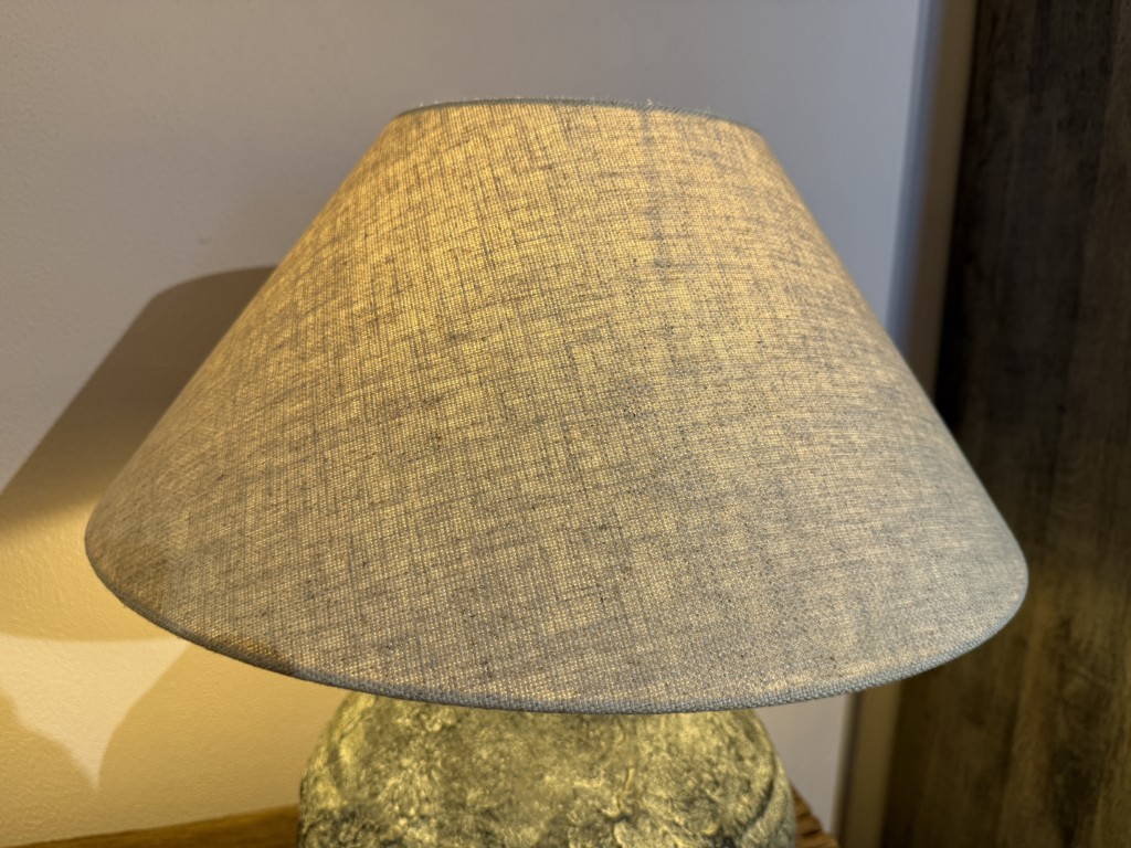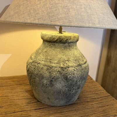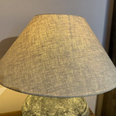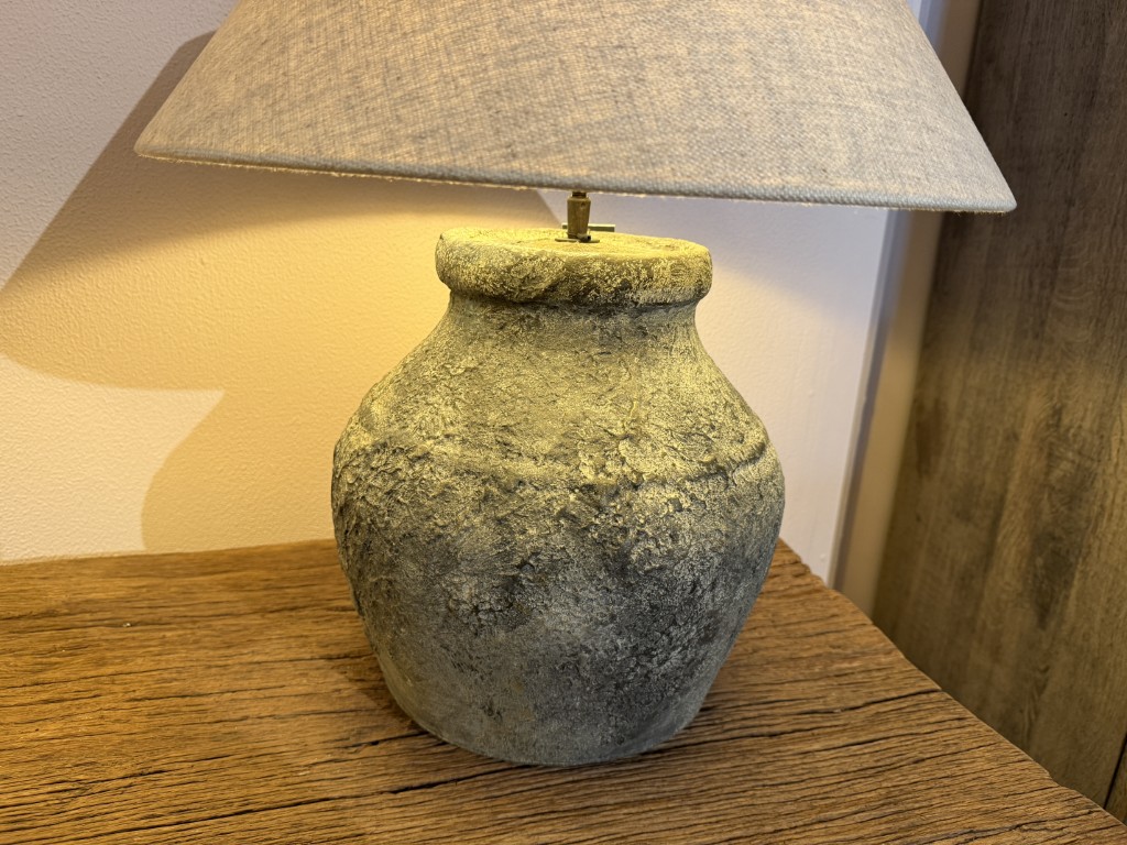 Kruiklamp ‘Figo’, gemaakt van een stenen voet en een stoffen kap.