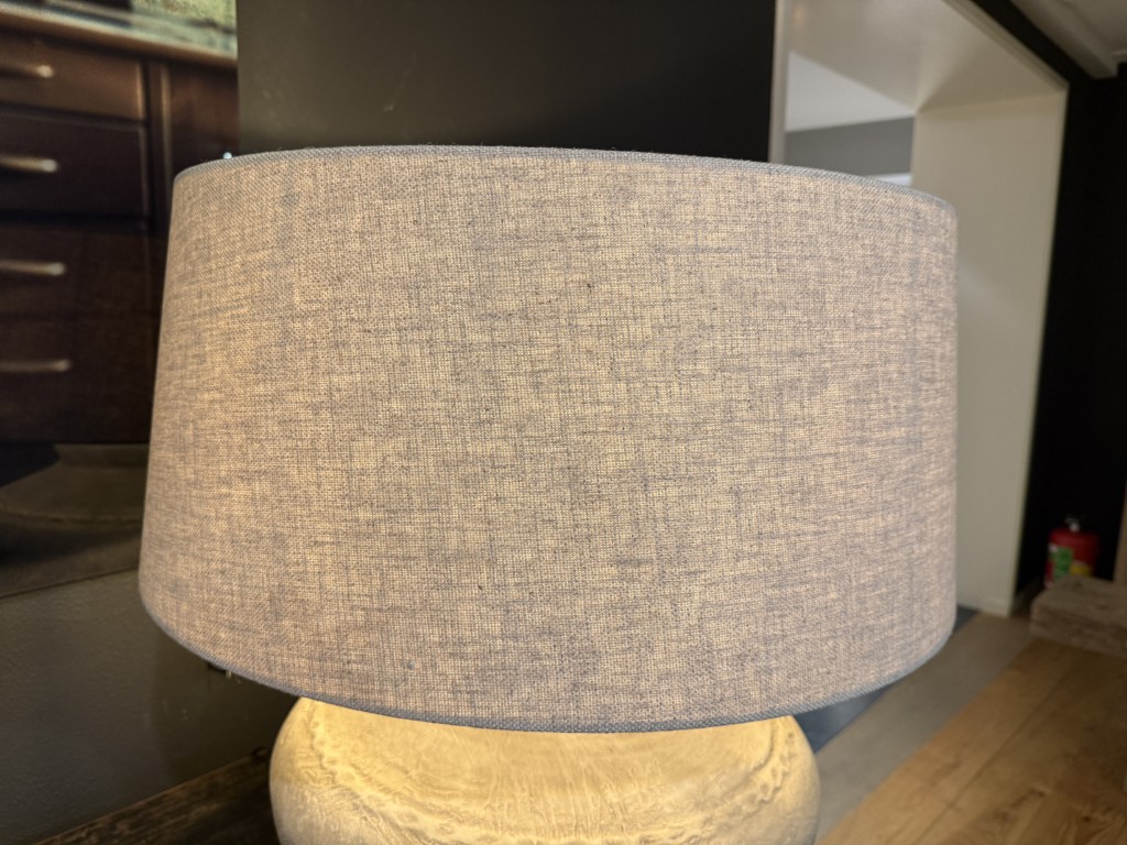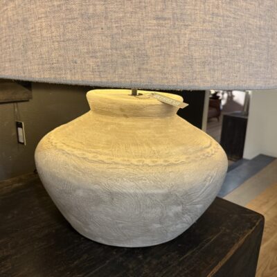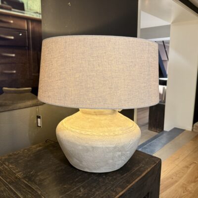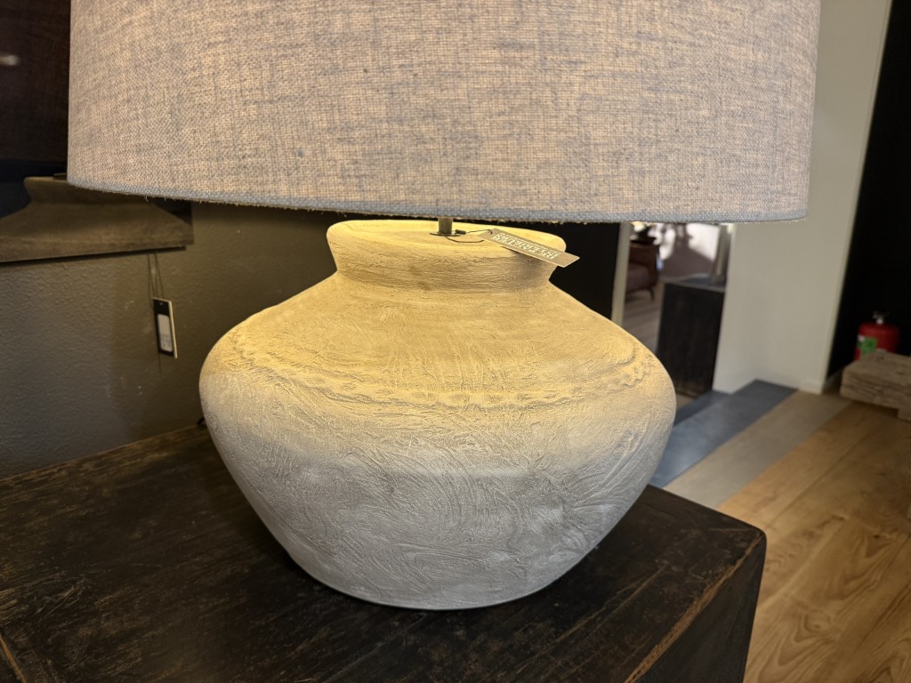 Kruiklamp ‘Todino’, gemaakt van een stenen voet en een stoffen kap.