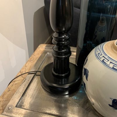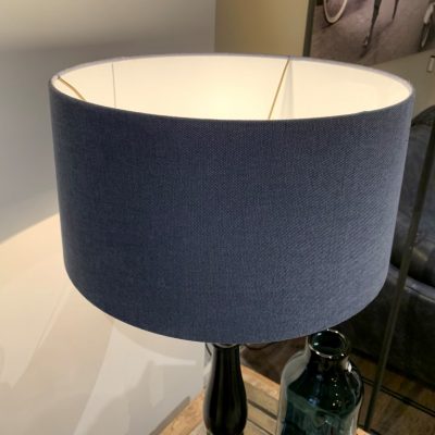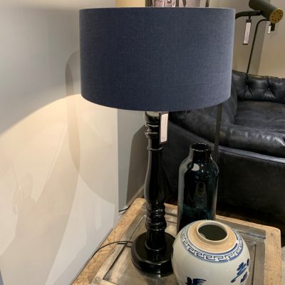 Lamp ‘Cayenne’ met een zwarte voet van hout en een blauwe, stoffen kap.
