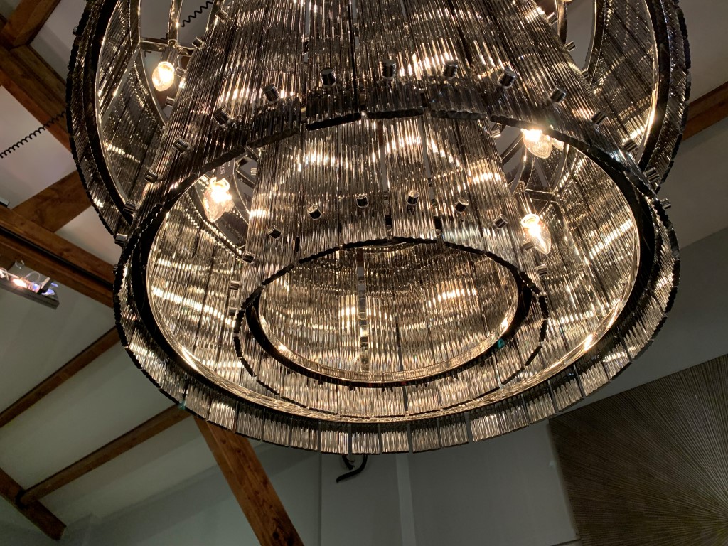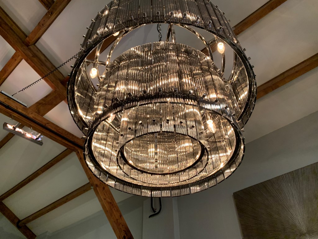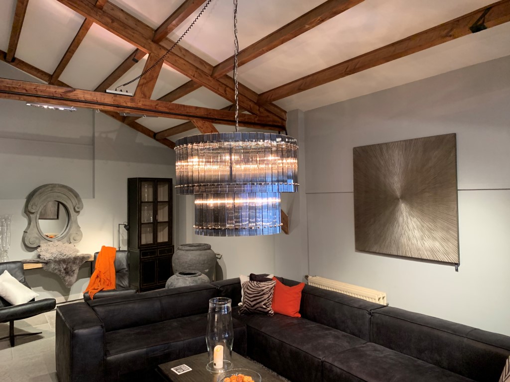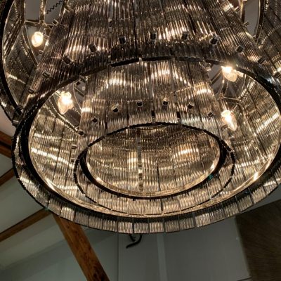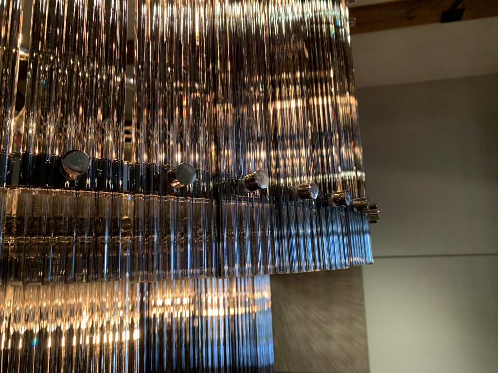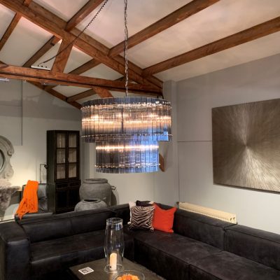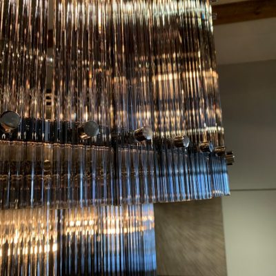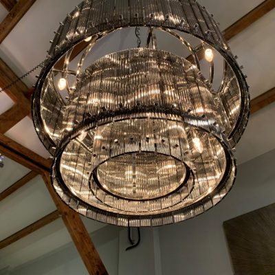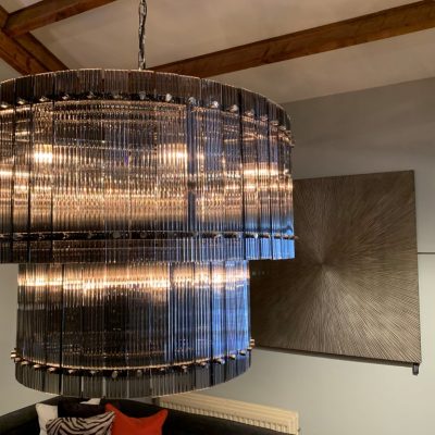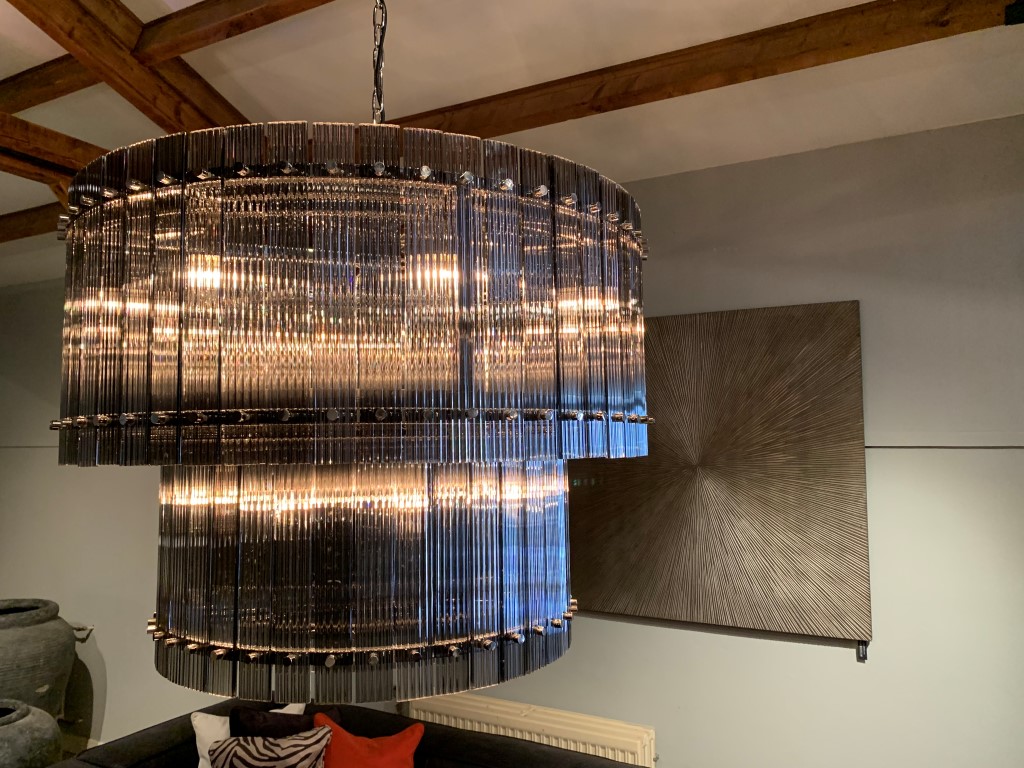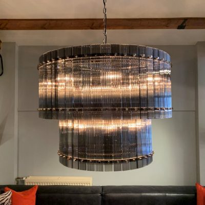 Voor een glamorous en eigentijdse esthetiek, maak een statement met de Ruby L Chandelier. Deze verleidelijke armatuur met 16 lichtpunten en nikkelafwerking, een moderne kijk op een klassieke stijl, heeft een taps toelopend ontwerp met twee niveaus en rijen geribbeld rookglas.