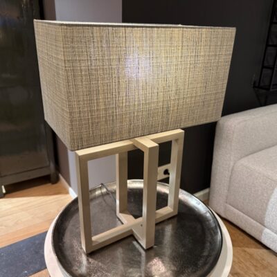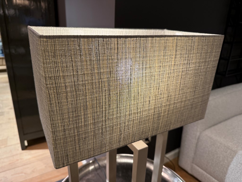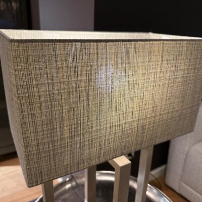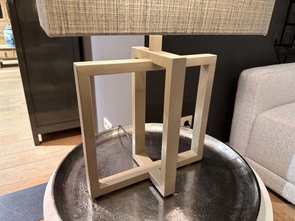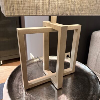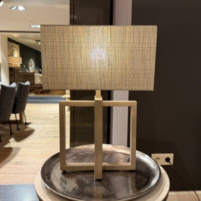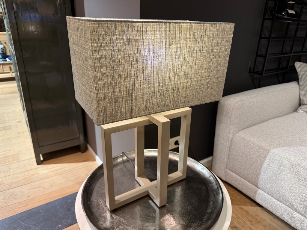 Tafellamp ‘Bas’ met een grijs metalen frame en een stoffen kap.