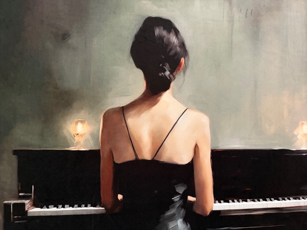 Afbeelding ‘Piano Girl’, gedrukt op een fluwelen canvas. Ook in andere afmetingen verkrijgbaar.