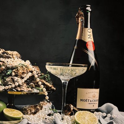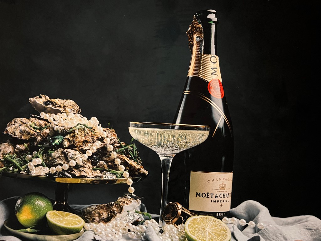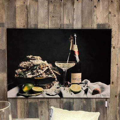 Wanddecoratie ‘Still life with pearl & champy’, afgedrukt op een canvas van fluwelen stof.