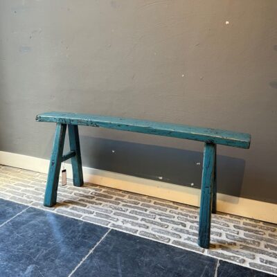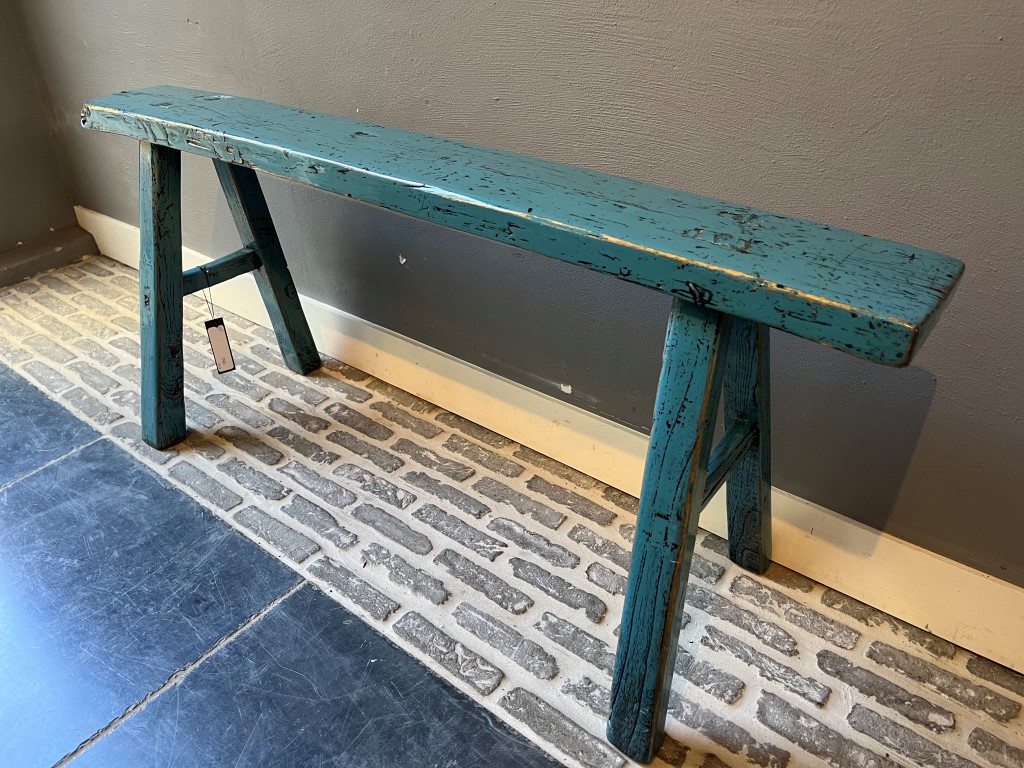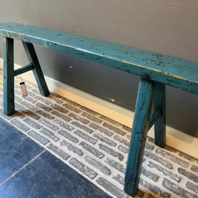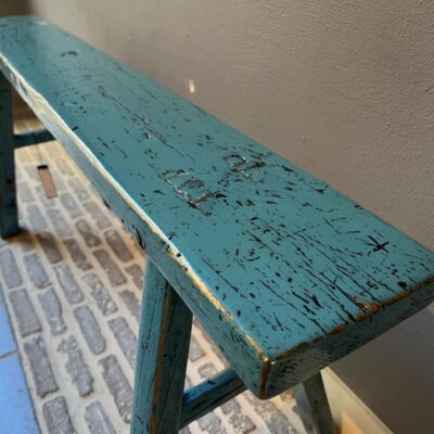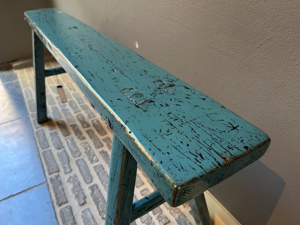 Hellblau lackierte Bank aus altem Kiefernholz.
