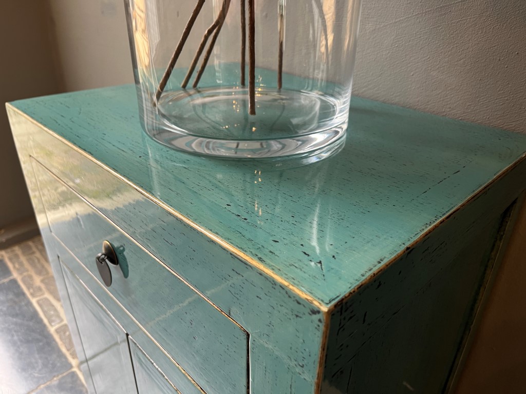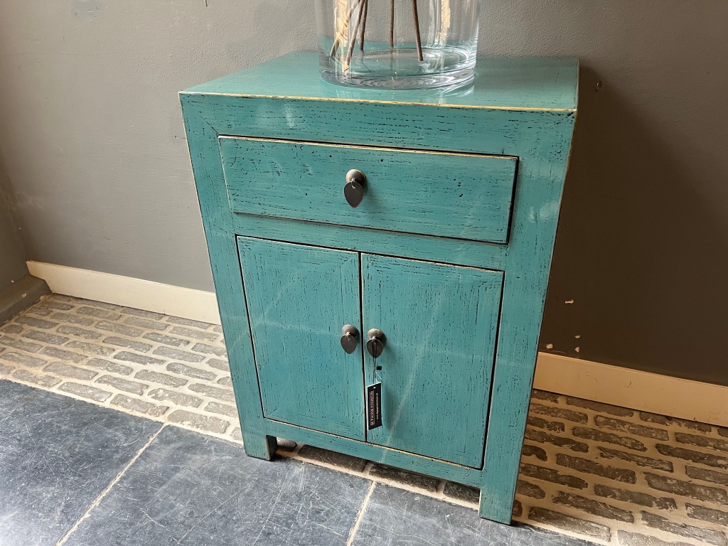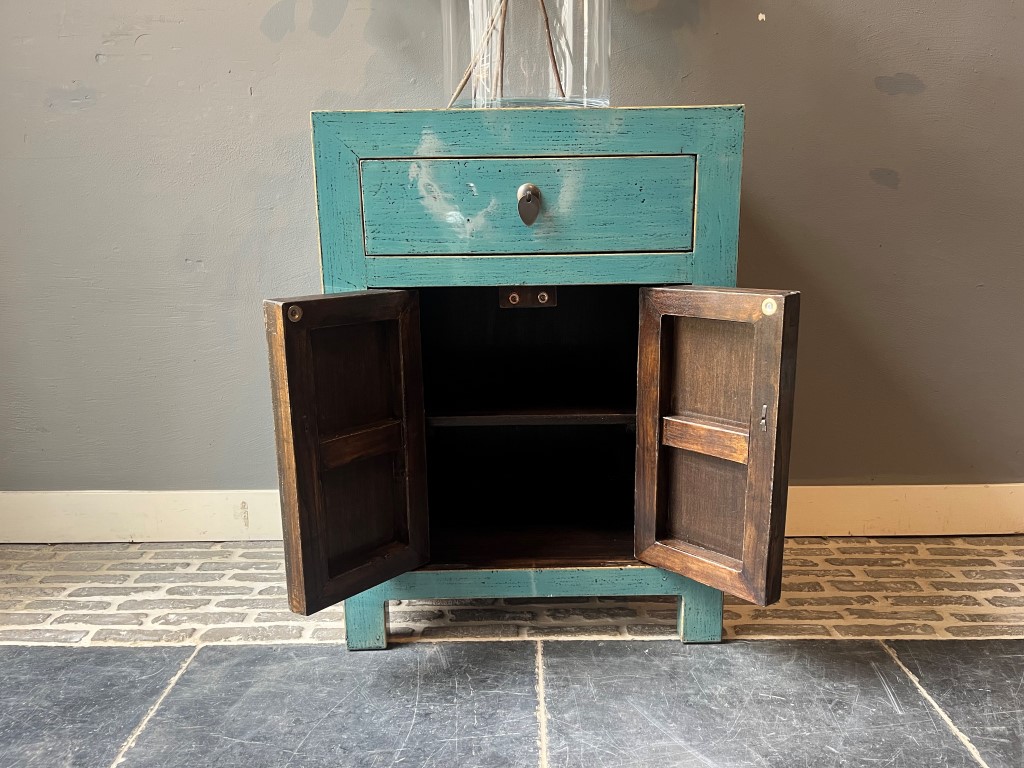 Türkis lackierter Nachttisch ‘Almeria’ mit 1 Schublade und 2 Türen, aus altem Kiefernholz.