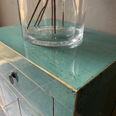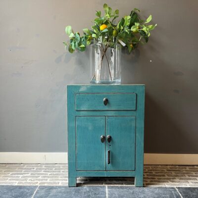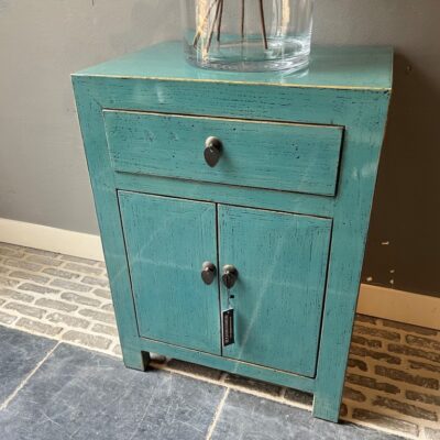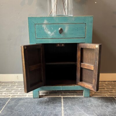 Türkis lackierter Nachttisch ‘Almeria’ mit 1 Schublade und 2 Türen, aus altem Kiefernholz.