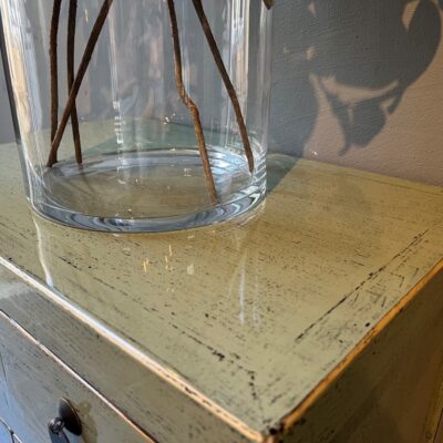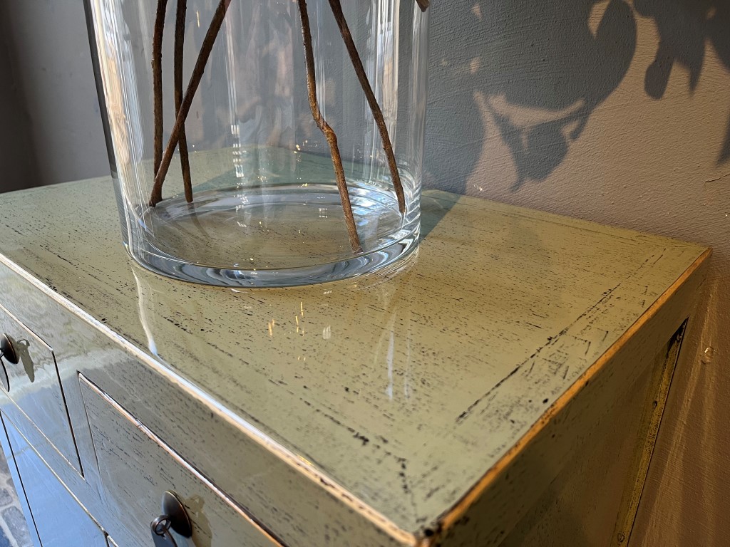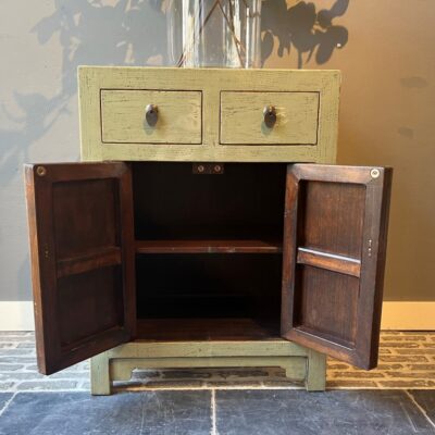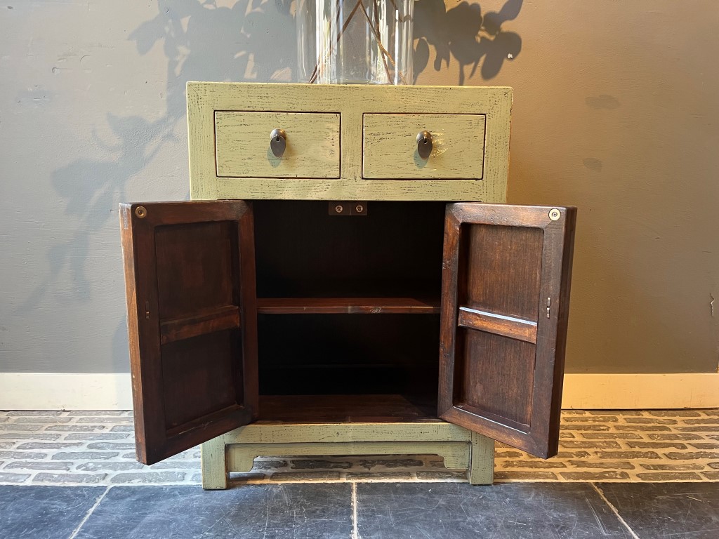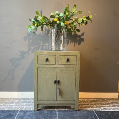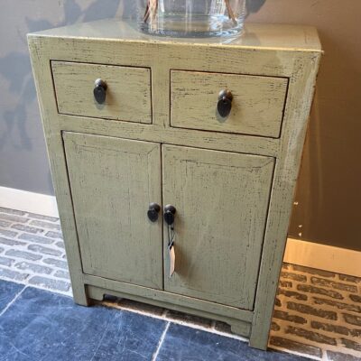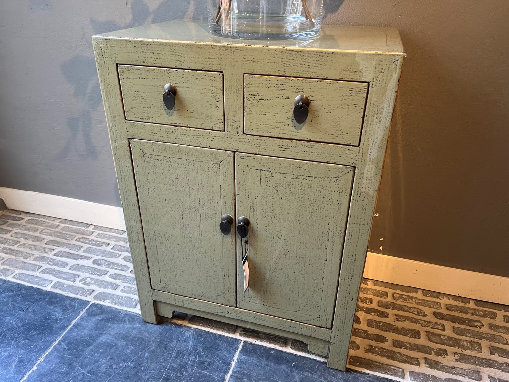 Hellgrau lackierter Schrank ‘Bastia’ mit 2 Schubladen und 2 Türen, aus altem Kiefernholz. Auch in anderen Farben erhältlich.