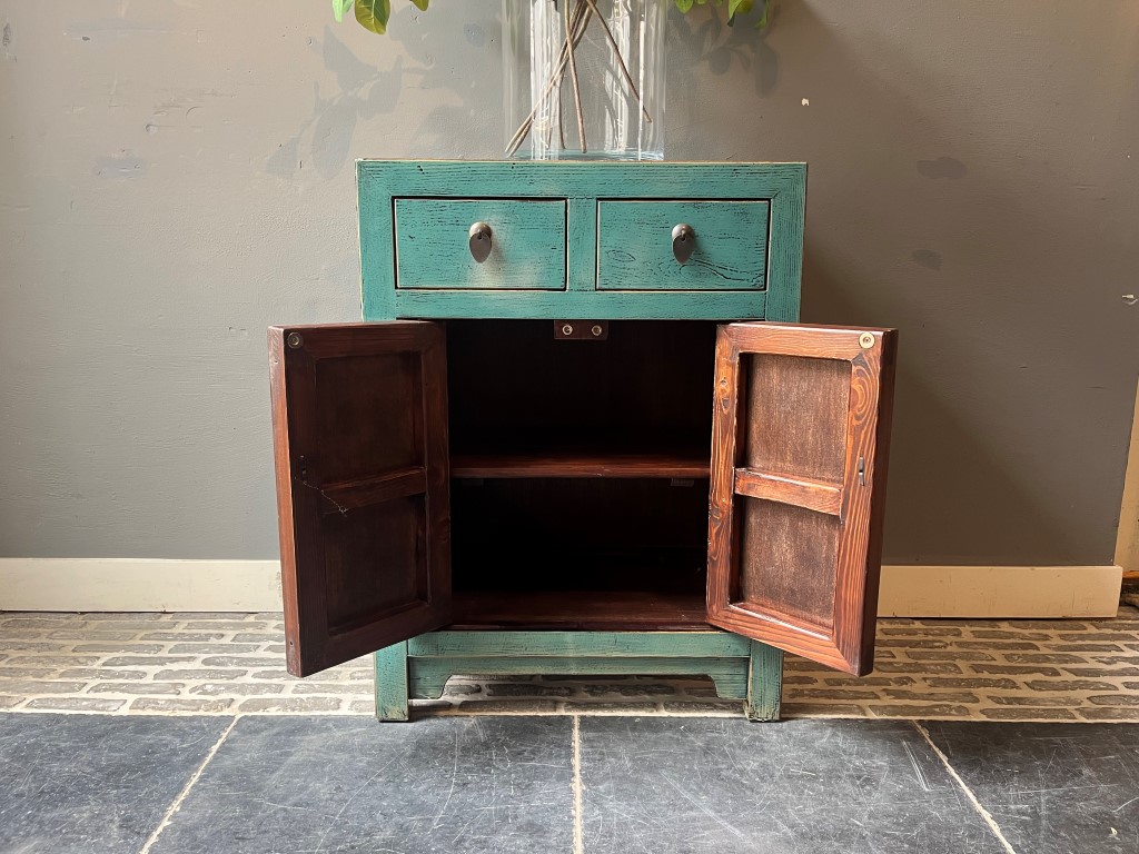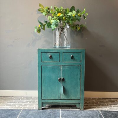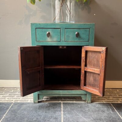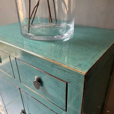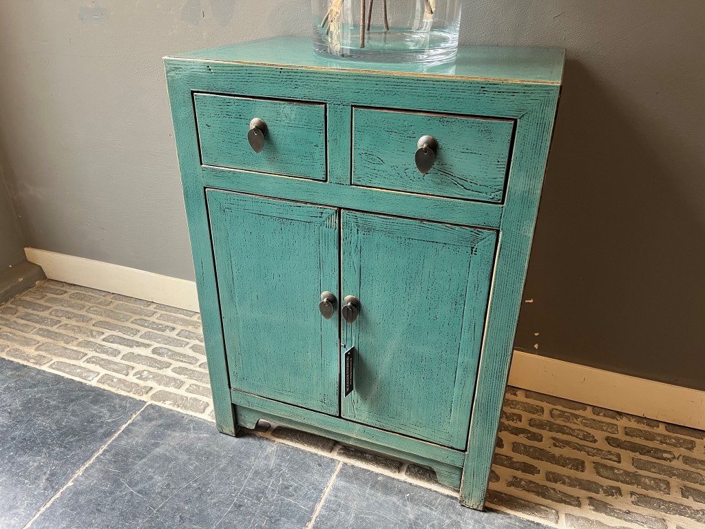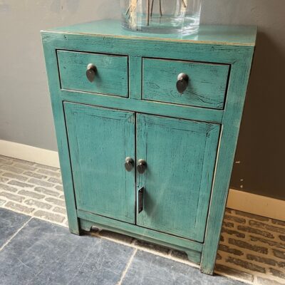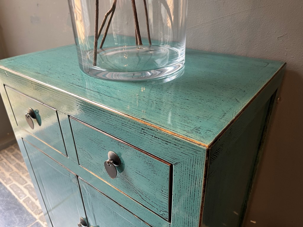 Türkis lackierter Schrank ‘Bastia’ mit 2 Schubladen und 2 Türen, aus altem Kiefernholz.