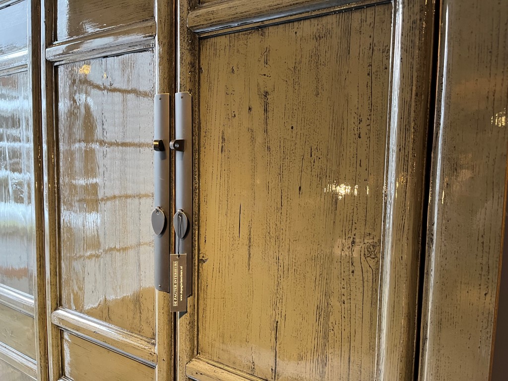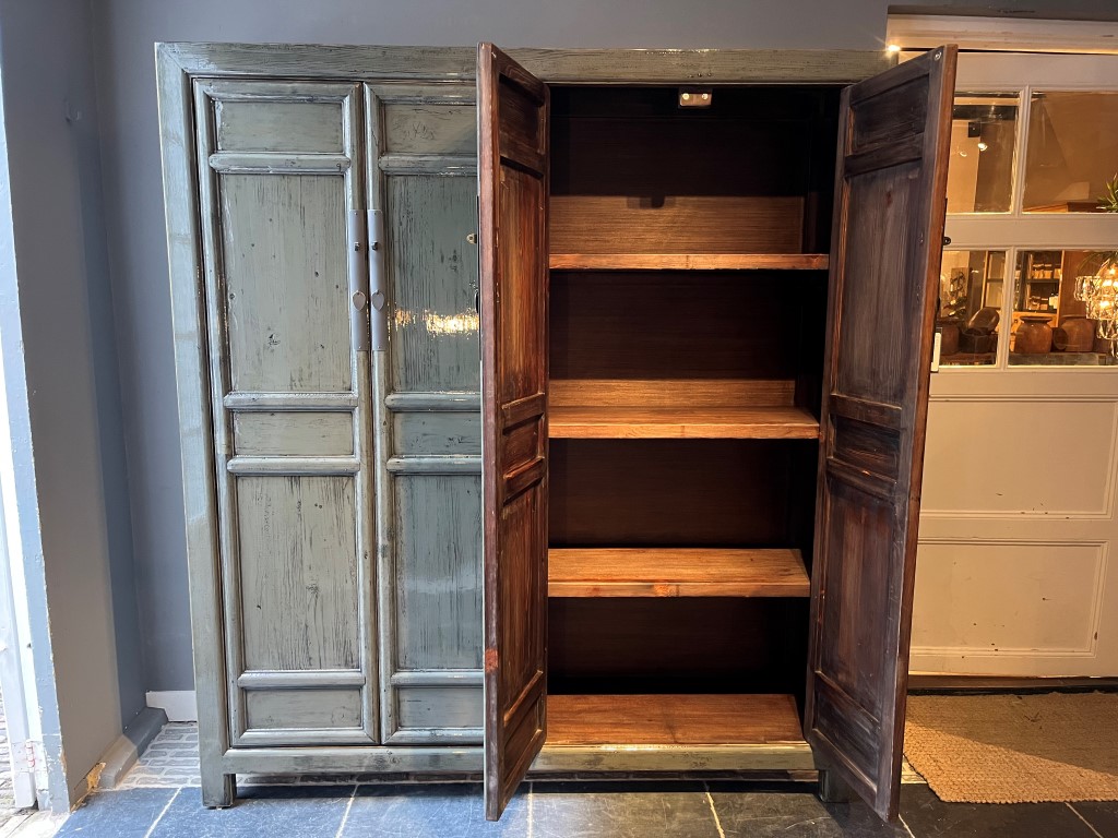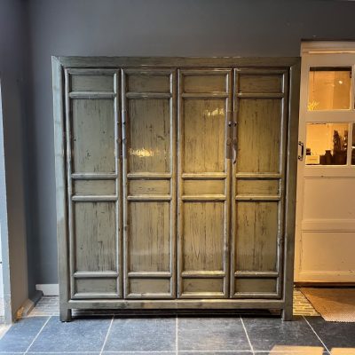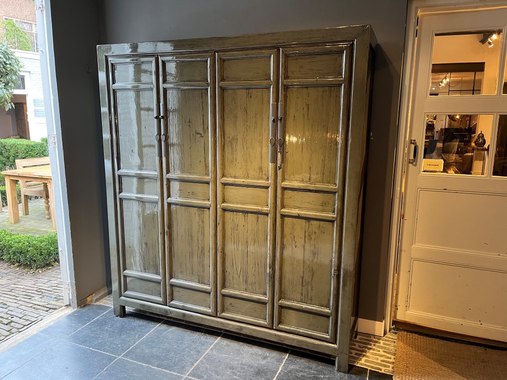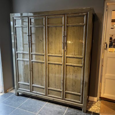 Grün lackierter Schrank ‘Montreal’ mit 4 Türen, aus altem Kiefernholz. Die Regale im Schrank sind abnehmbar.