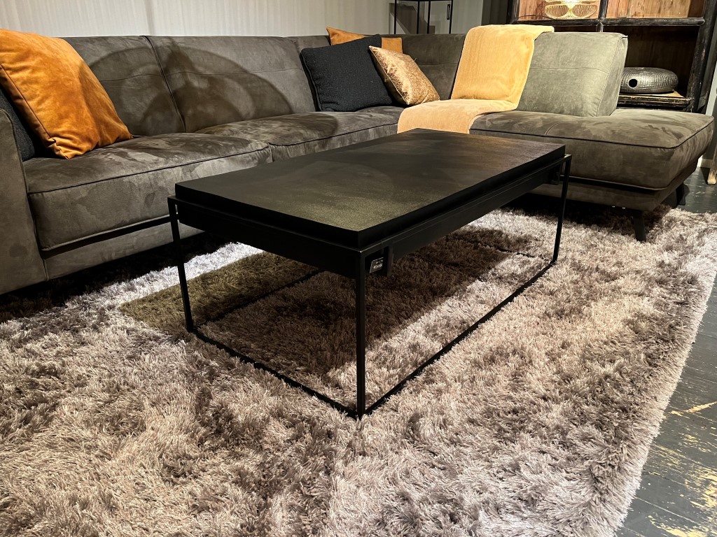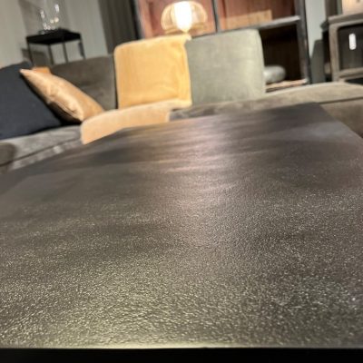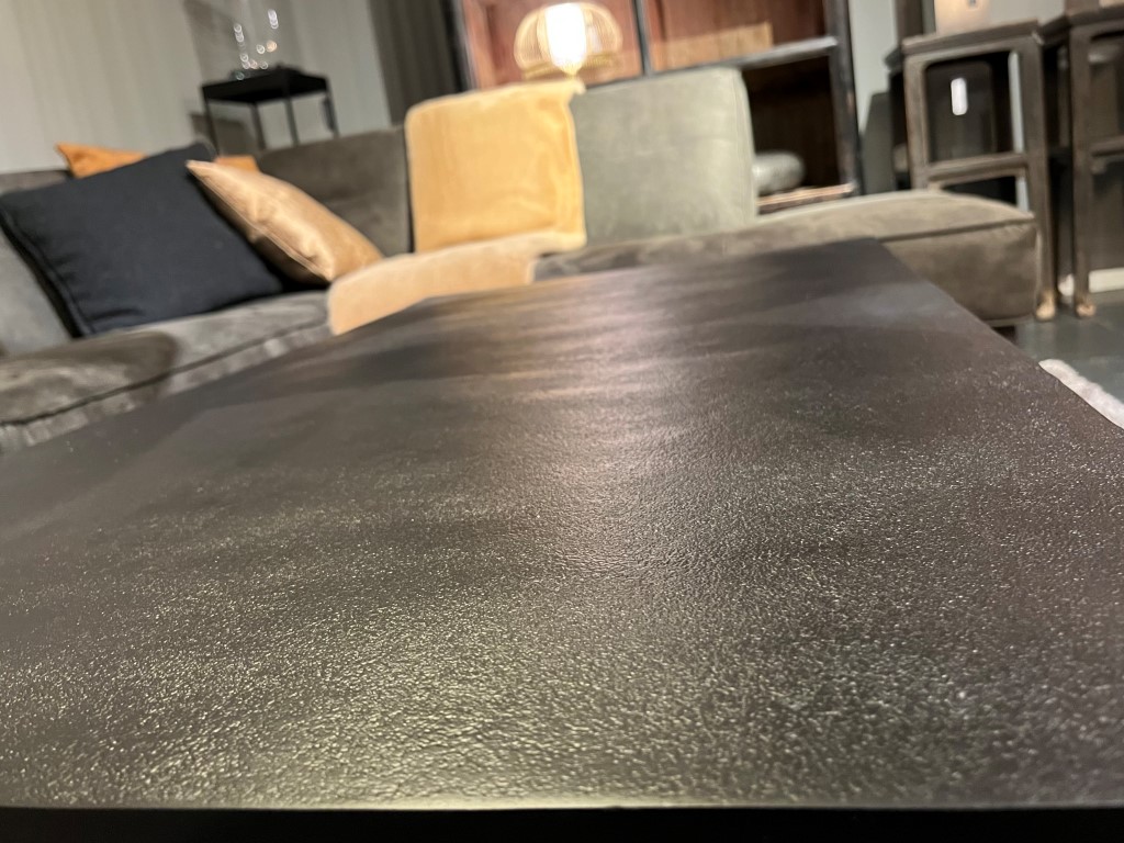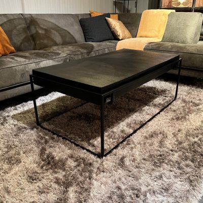 Couchtisch mit schwarzer Aluminiumplatte und Stahlgestell.