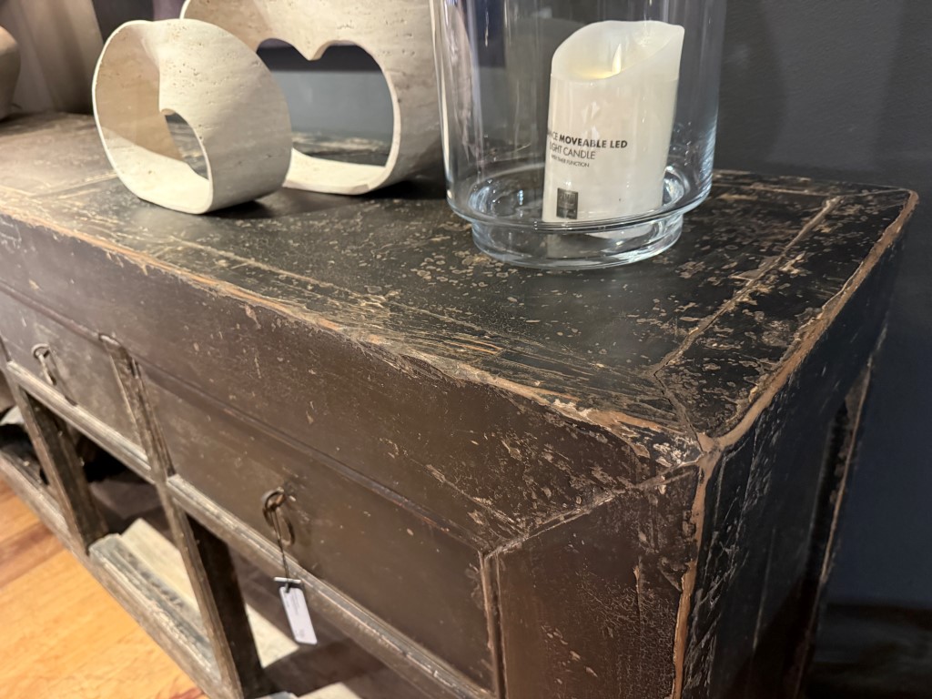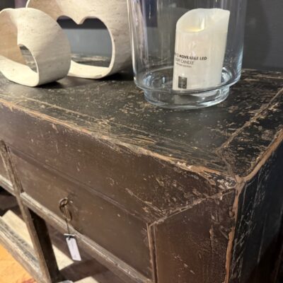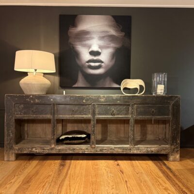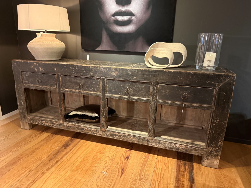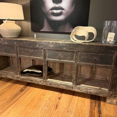 Antique Chinese counter with 4 drawers and an open bottom, made of old pine wood.