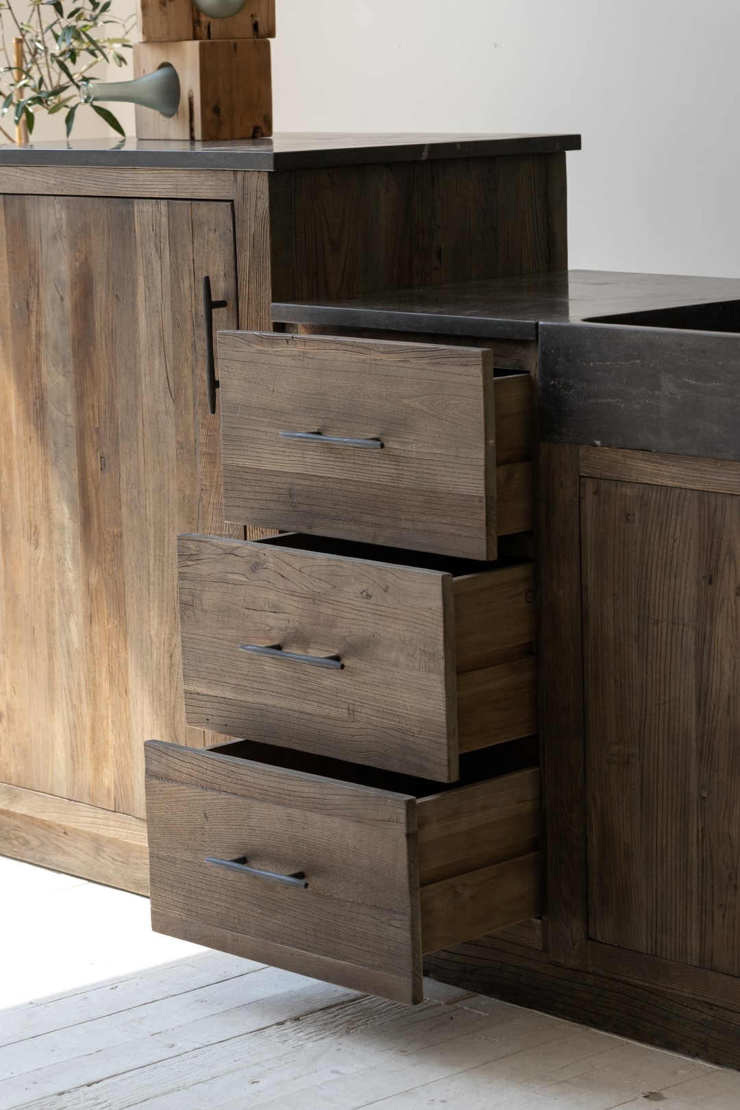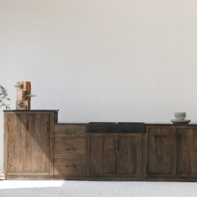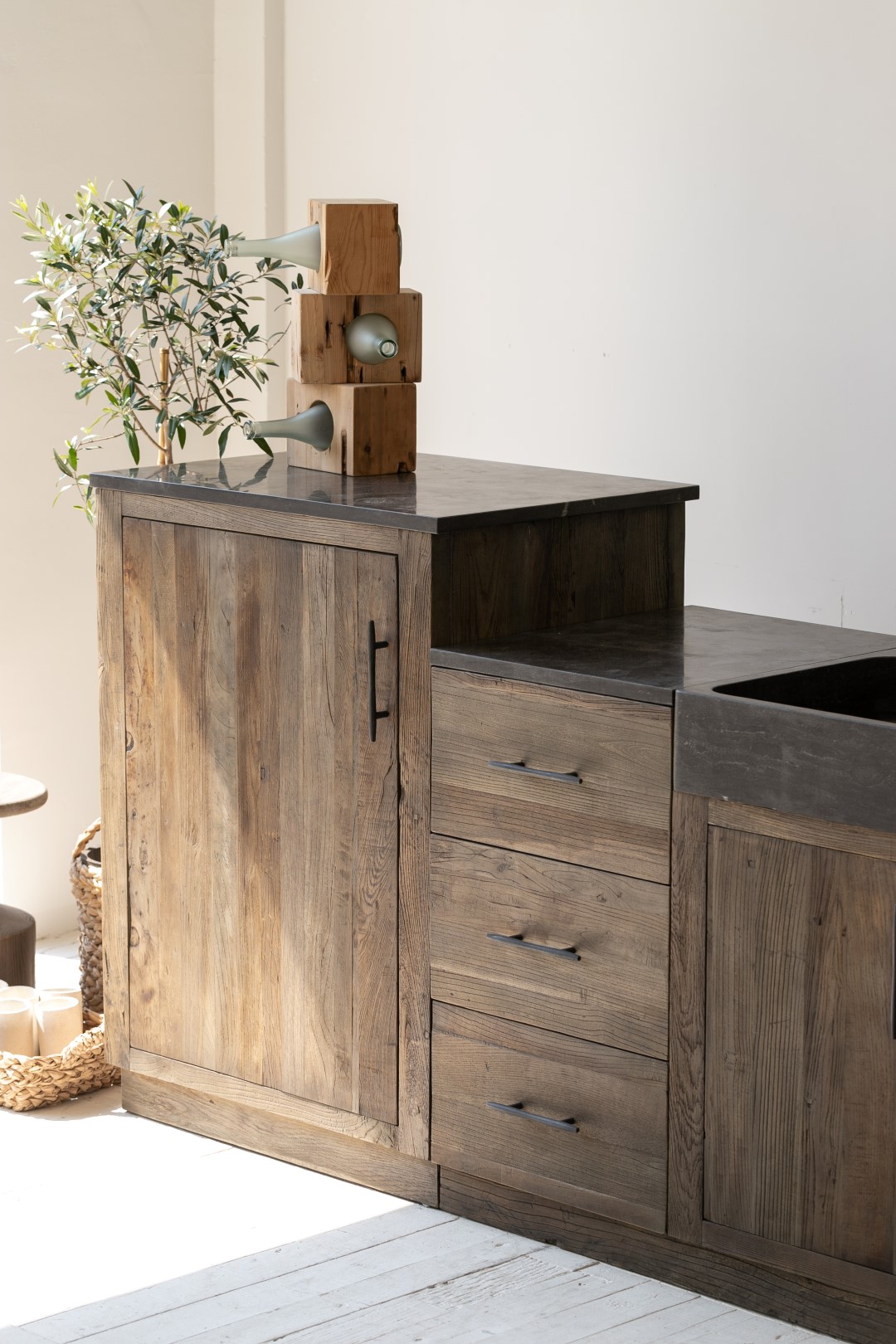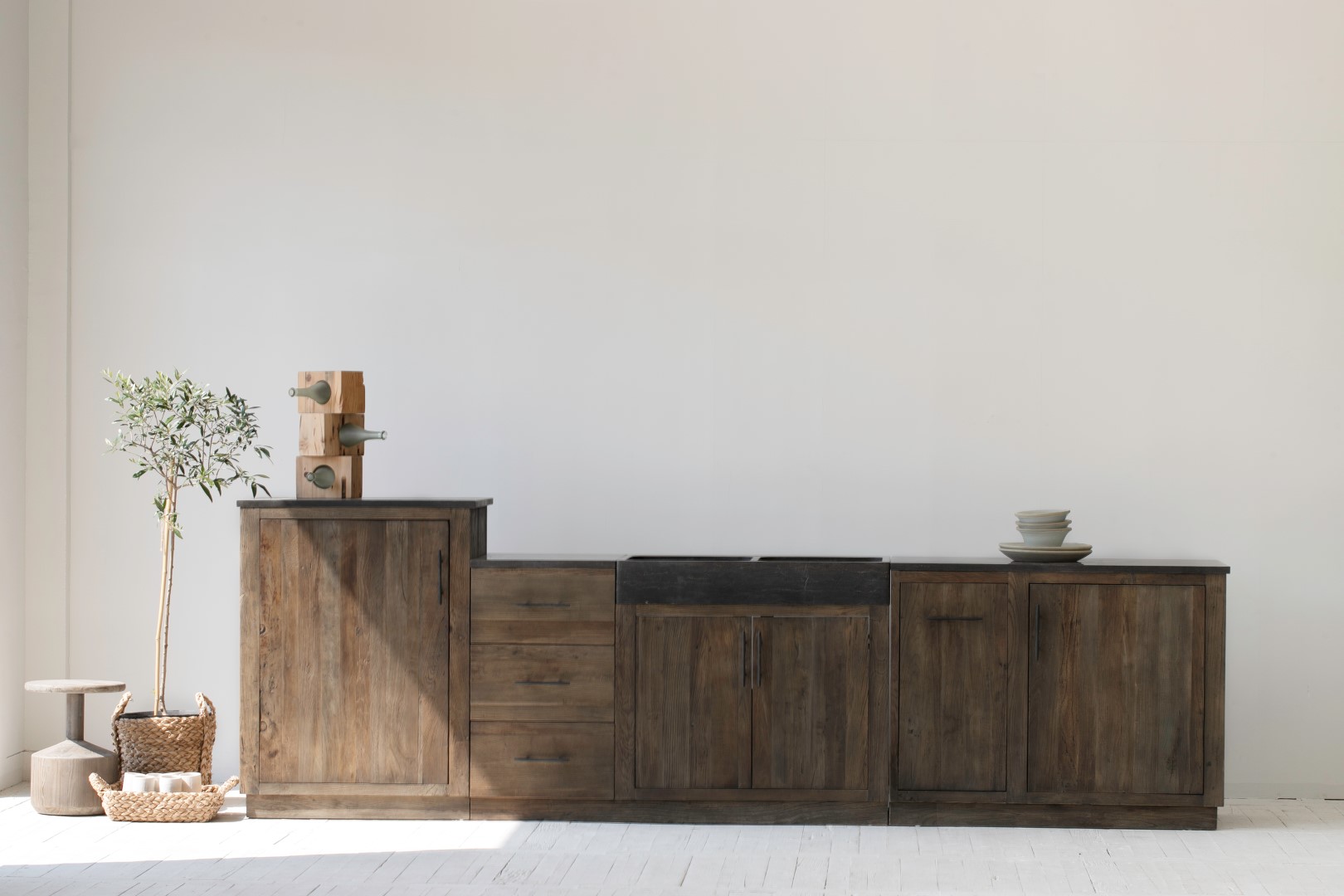 From left to right: Three drawers, a cupboard with double doors, a cupboard for herbs and oils and a cupboard with a single door.