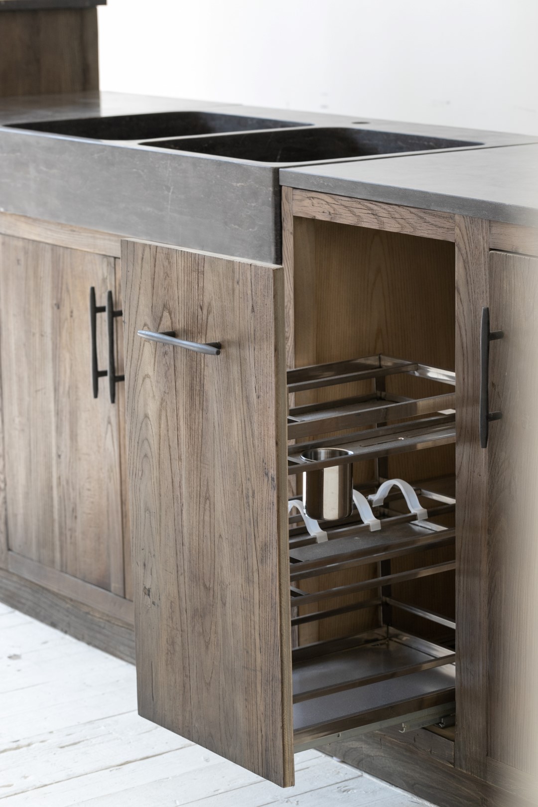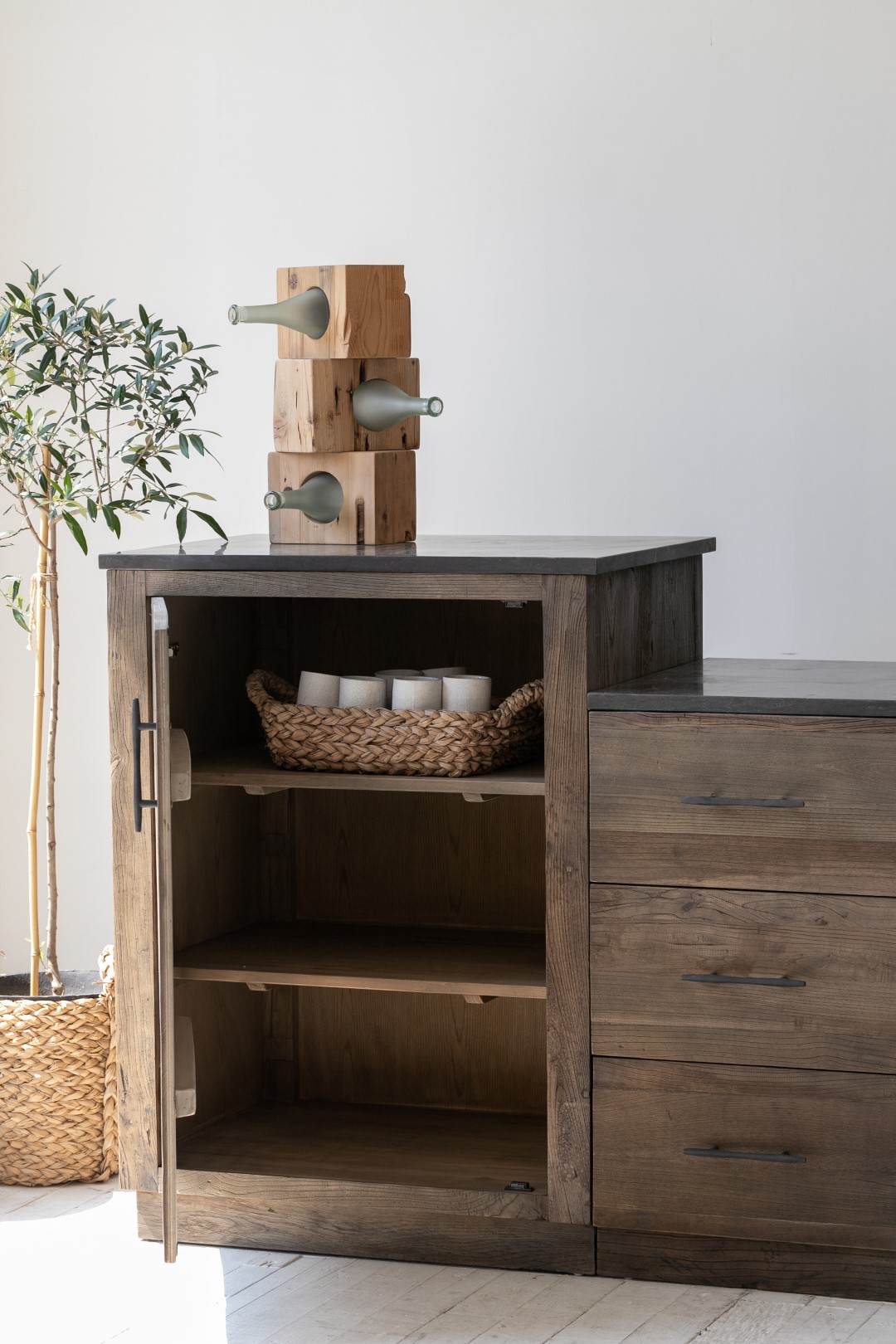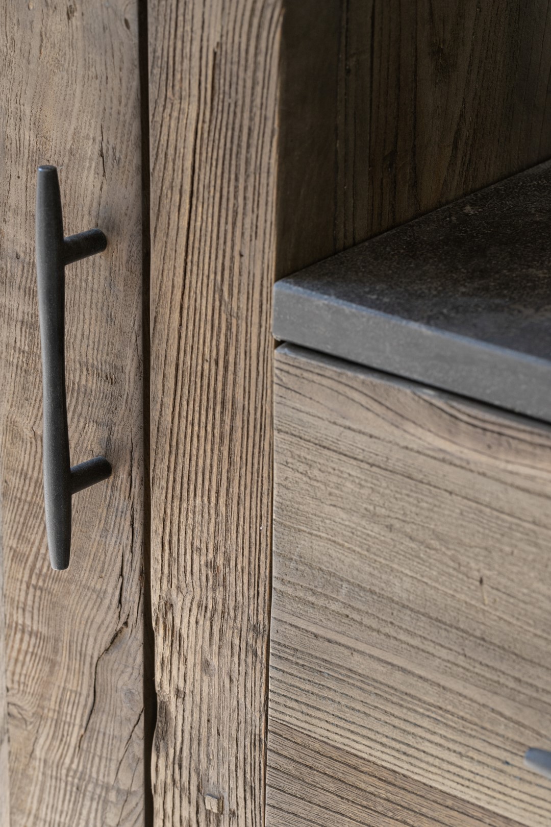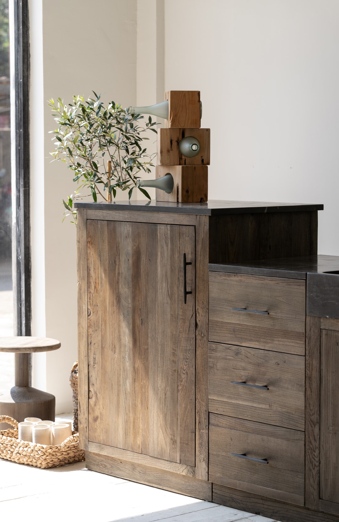 From left to right: Three drawers, a cupboard with double doors, a cupboard for herbs and oils and a cupboard with a single door.