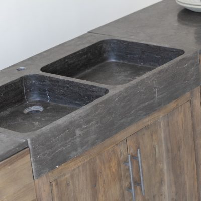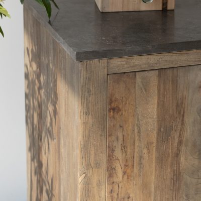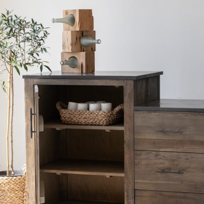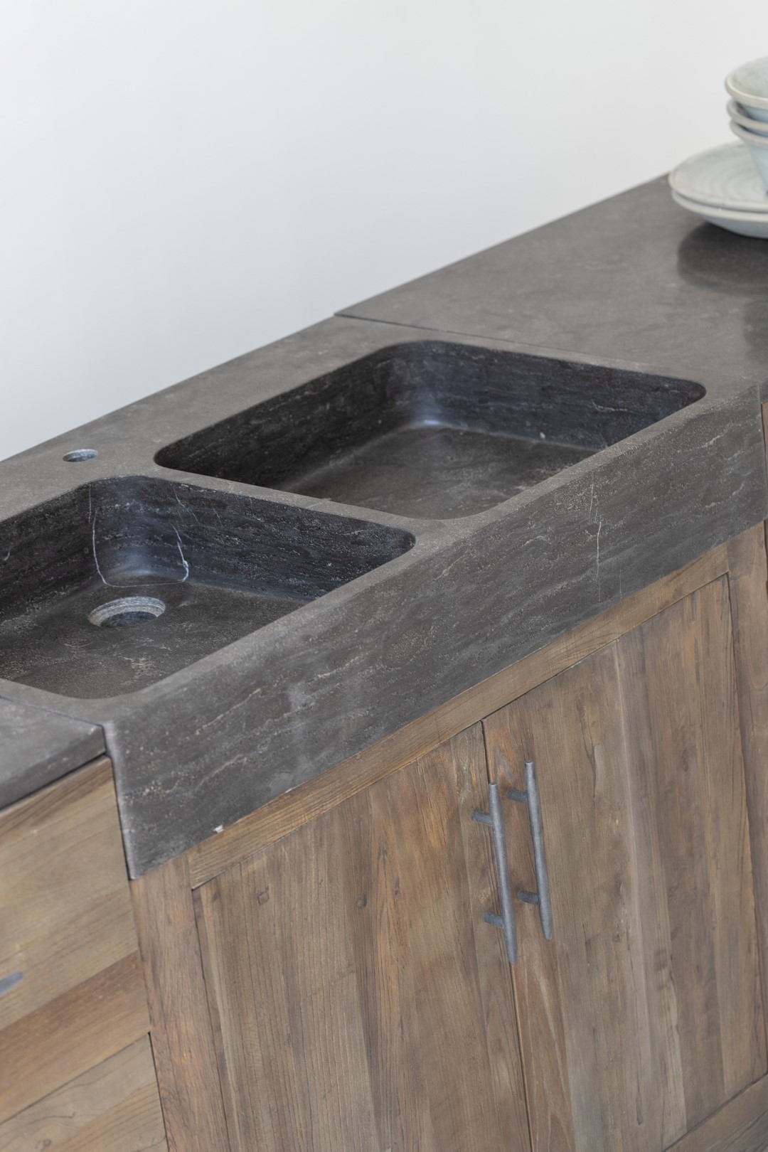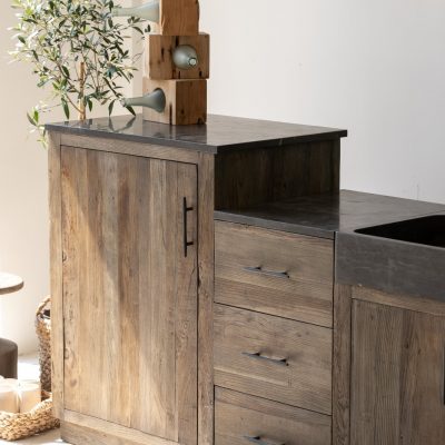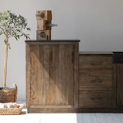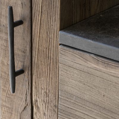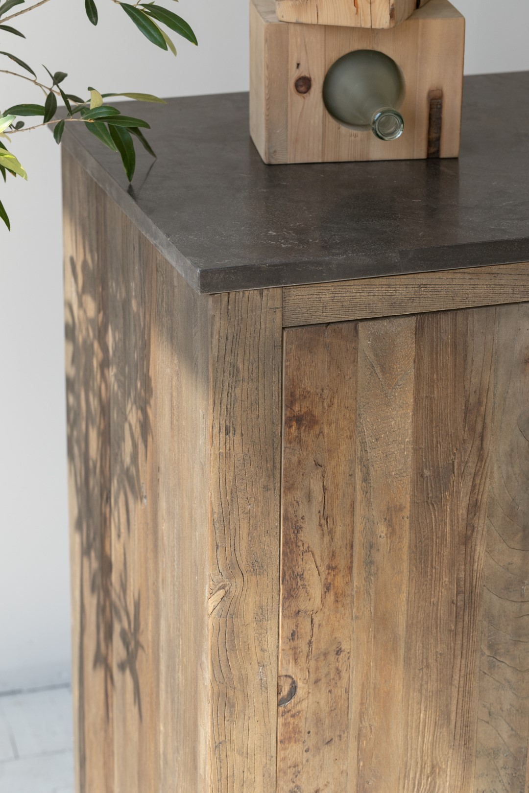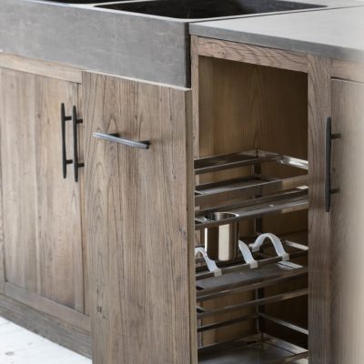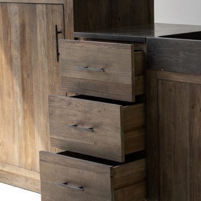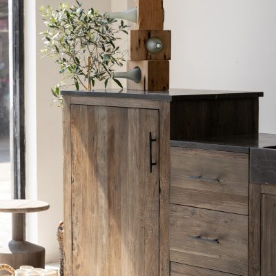 From left to right: Three drawers, a cupboard with double doors, a cupboard for herbs and oils and a cupboard with a single door.