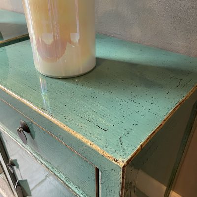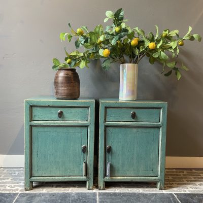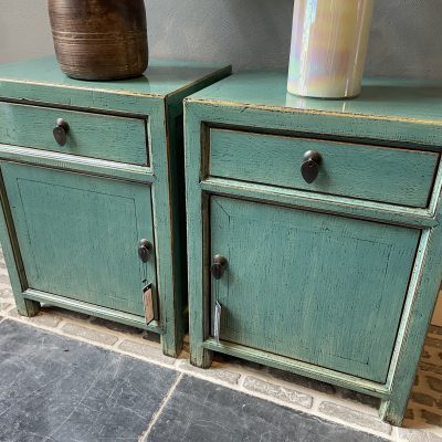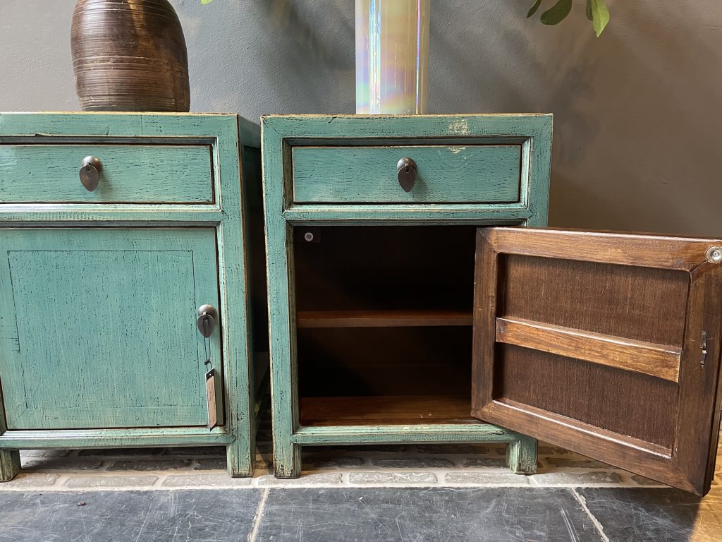 Bedside table ‘Mira’ with 1 drawer and 1 door, lacquered in turquoise. Also available in dark green or blank old pine wood.