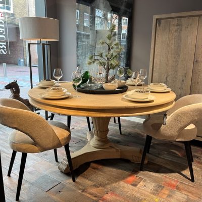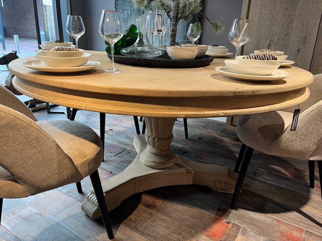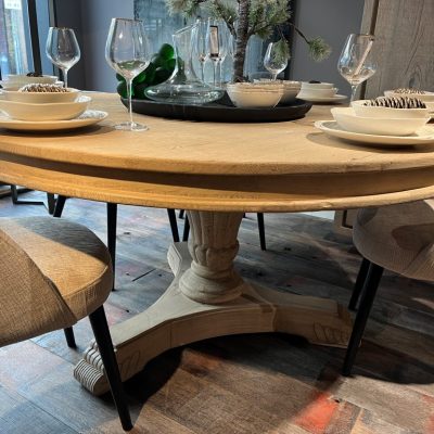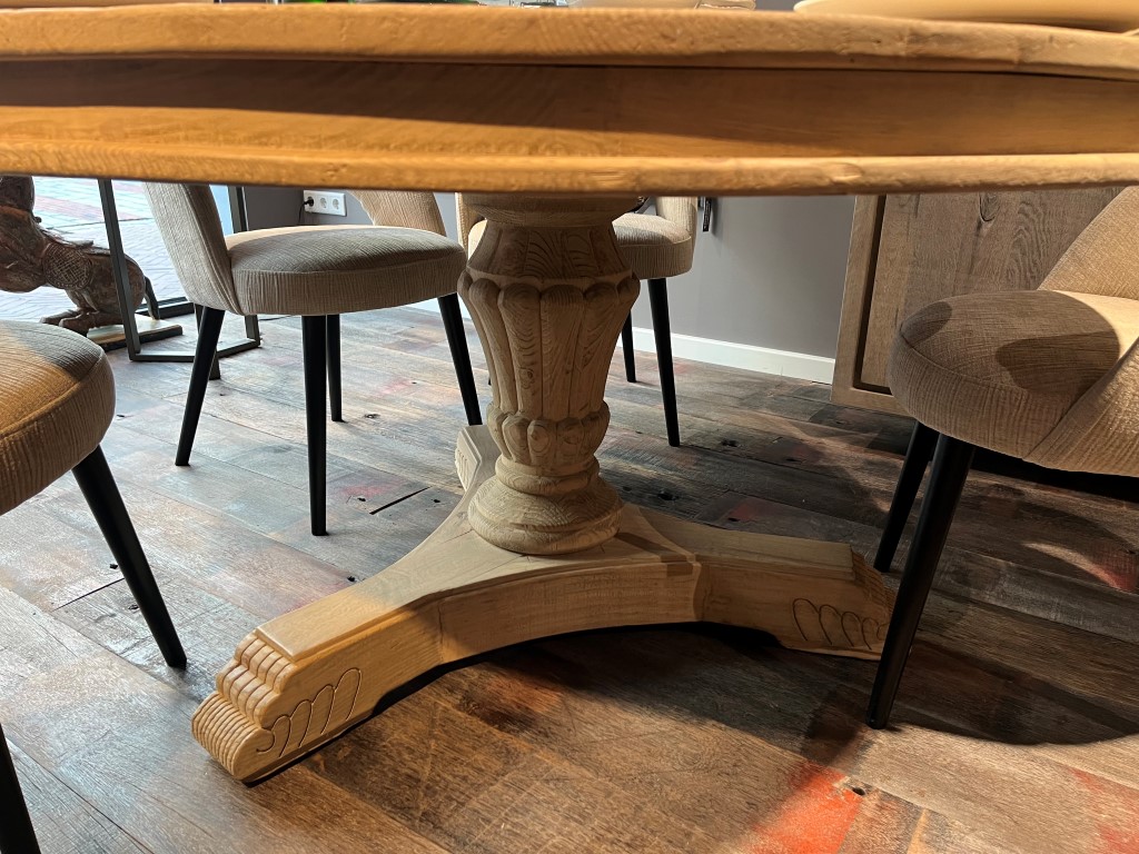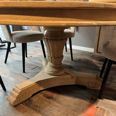 Round table ‘Monza’ with a decorative wooden leg, made of old pine wood.