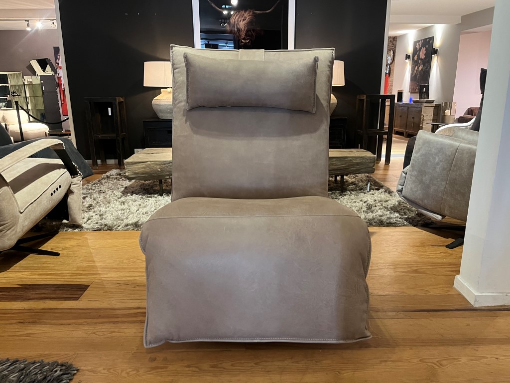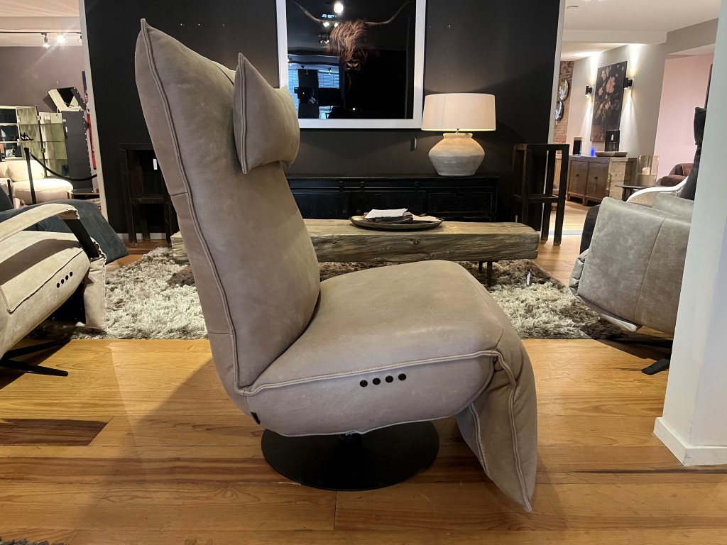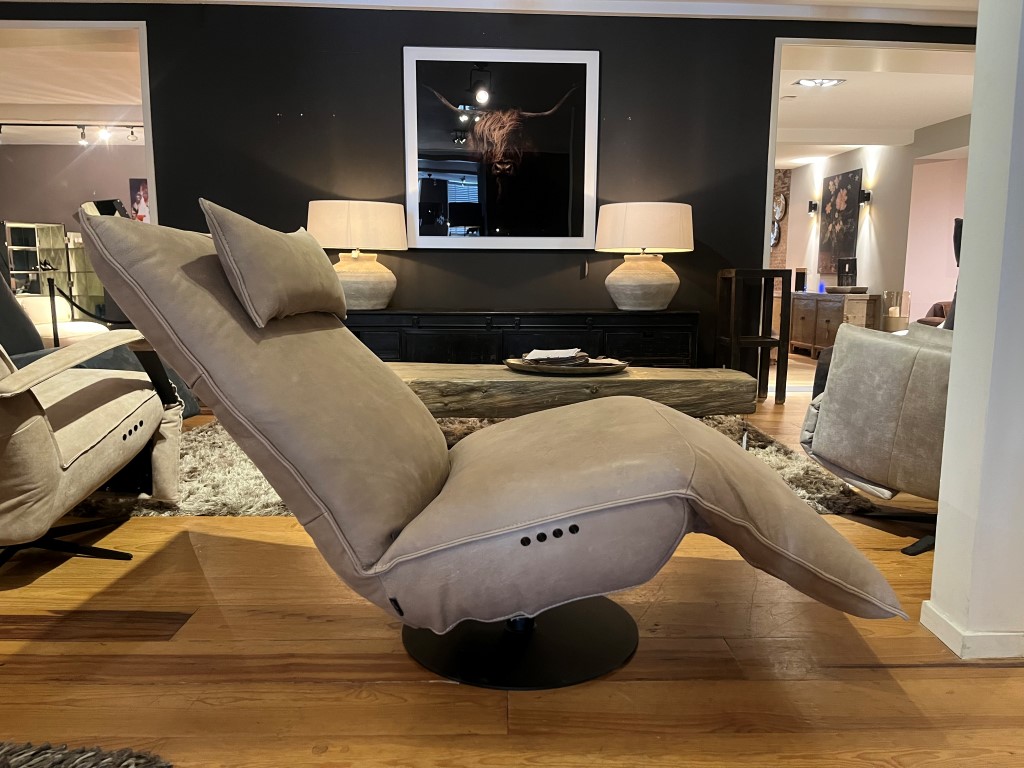 Luxury armchair Indi with electrically adjustable footrest and backrest that can be operated with touch buttons. Made in leather: Kenya – Taupe. Includes built-in battery, lumbar cushion, hood seam (5/contrast) and disc foot round black. Price is for the model shown. Check out all the options here .