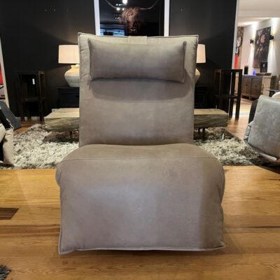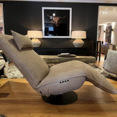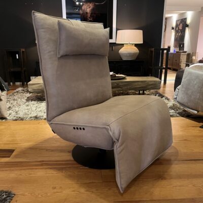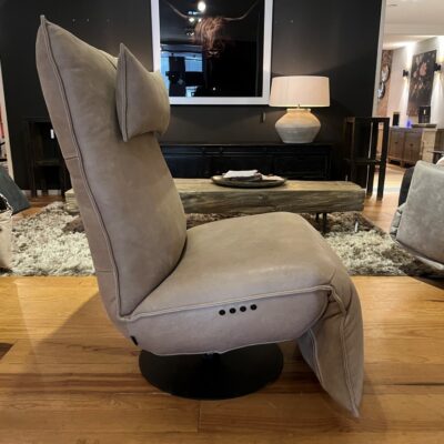 Luxury armchair Indi with electrically adjustable footrest and backrest that can be operated with touch buttons. Made in leather: Kenya – Taupe. Includes built-in battery, lumbar cushion, hood seam (5/contrast) and disc foot round black. Price is for the model shown. Check out all the options here .