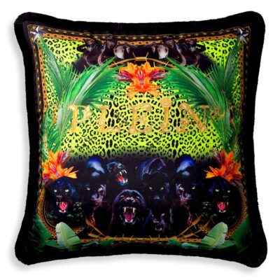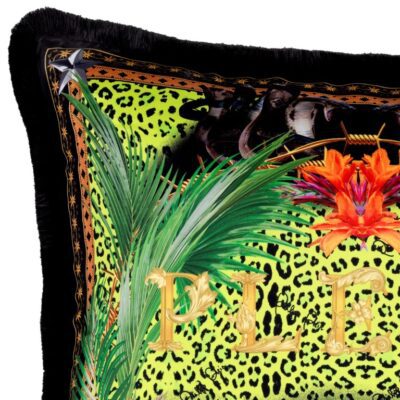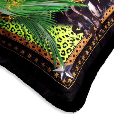 With its generous dimensions of 70×70 cm and made in Italy, the silk printed Jungle cushion feels lovely and wild with its specially designed print featuring jungle animals and lush wildlife, finished with a golden Plein signature.